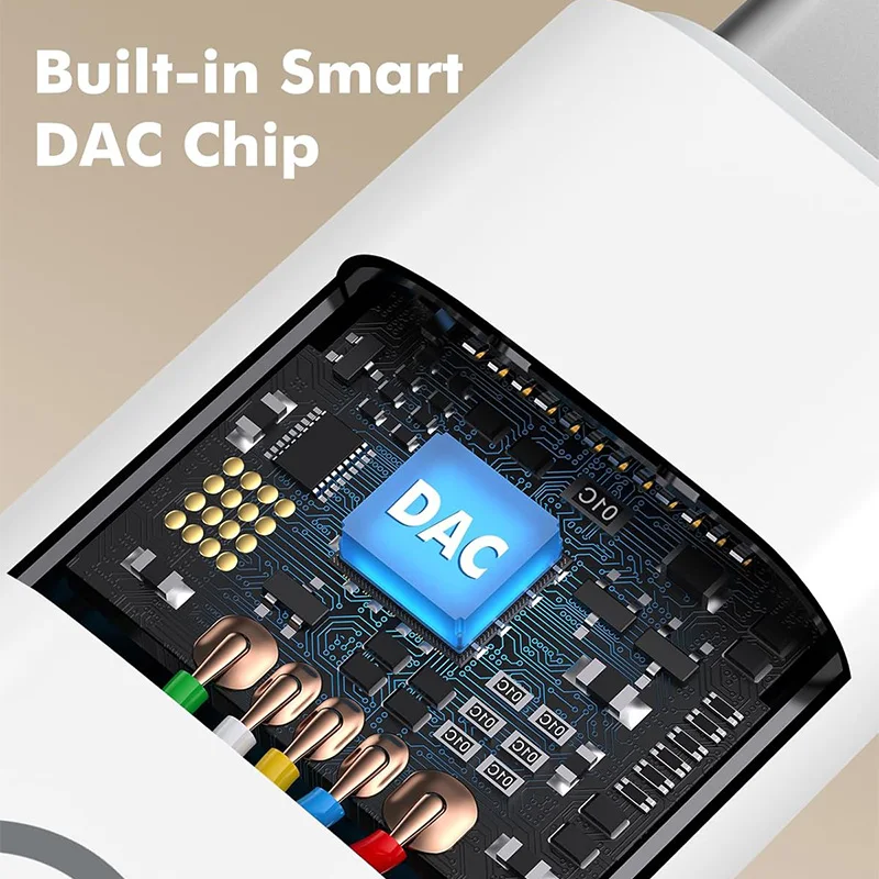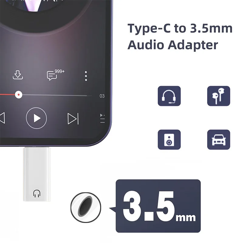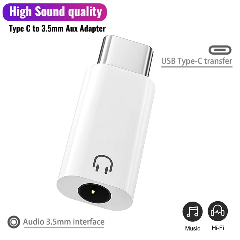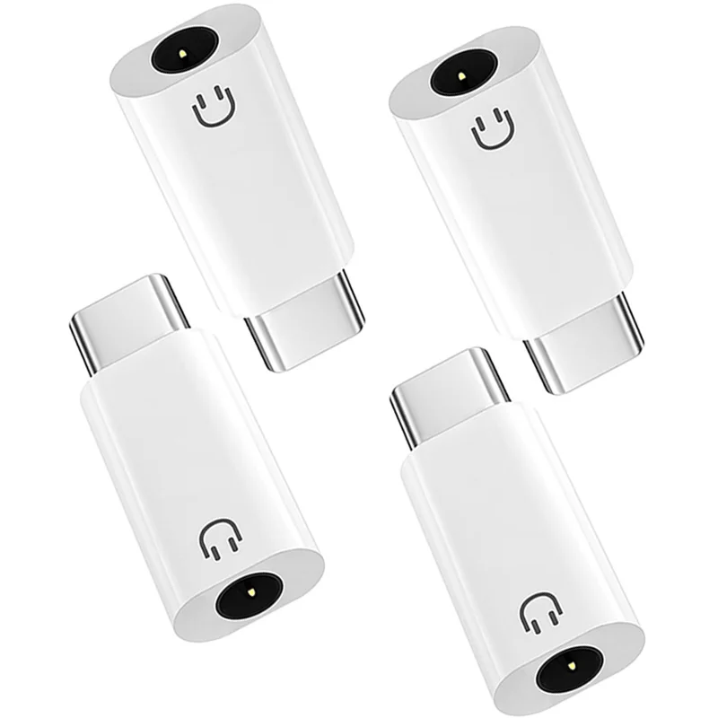 This sleek USB-C to 3.5mm audio adapter features a white matte finish with a compact rectangular design, a metallic Type-C connector, and a black headphone icon on the front. It allows seamless connection of headphones and other audio devices to compatible smartphones, tablets, and laptops, including Samsung Galaxy S series, Note series, A series, Pixel devices, iPads, and MacBooks. With an input and output voltage of 5V, it supports high-quality sound transfer without amplification or harmful chemicals. Designed for convenience, it’s available in packs of 1, 2, or 4 units, offering reliable performance and a modern aesthetic for your daily audio needs.