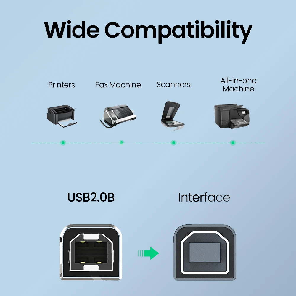 - The opposing end has a standard USB Type B connector, with a rectangular shape and beveled top edges for secure attachment to printers and scanners from popular brands like Canon, Epson, HP, and Samsung.