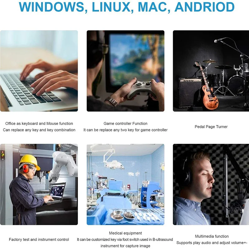 Experience seamless foot-controlled operation with the this USB Foot Pedal Control Switch. Designed for versatility, it allows you to control your computer using your foot, eliminating the need for traditional keyboard or mouse inputs. Perfect for gaming, industrial testing, medical ultrasound imaging, or aiding mobility, this device adapts effortlessly to various tasks. Its customizable functionality lets you program it to any key, sentence, or command using the dedicated “FootSwitch” software, stored directly in the pedal. With support for multiple pedals, you can create a tailored setup that enhances efficiency and comfort. Whether you're working on a PC, Mac, Linux, or Android, this foot switch provides practical, hands-free control. Imagine how this device streamlines your workflow or gaming experience.