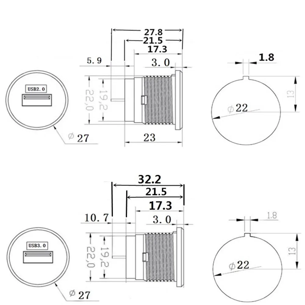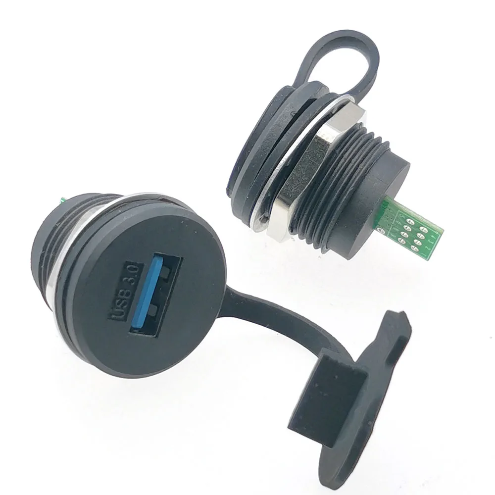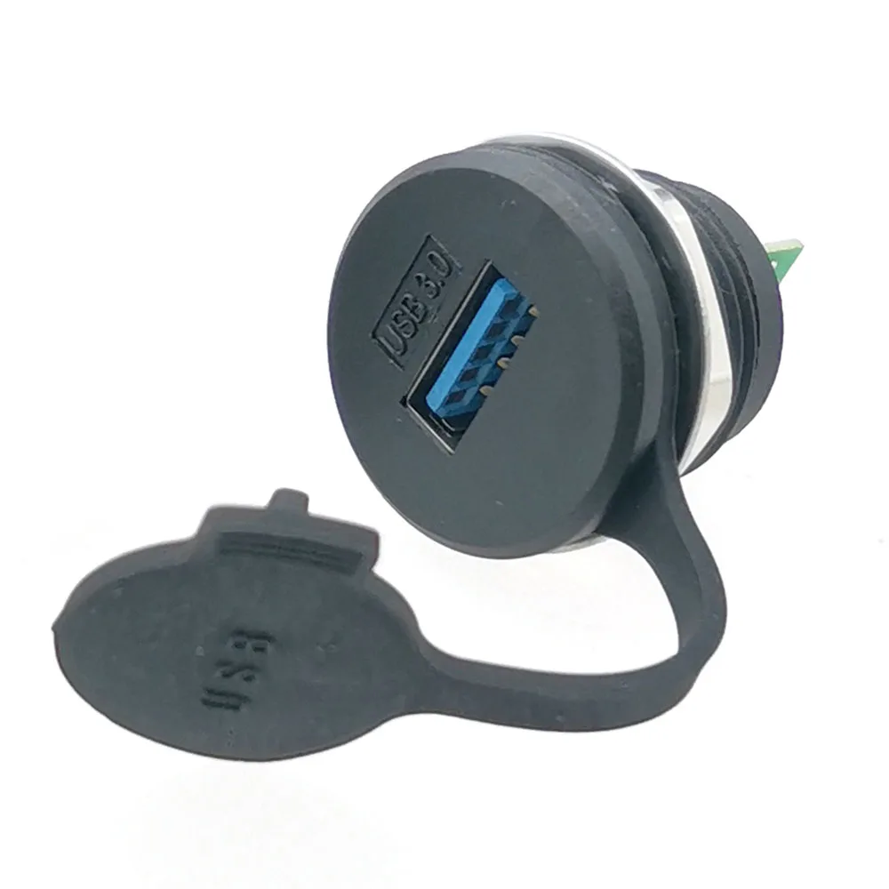 Experience seamless data transfer and power charging with this robust panel-mount USB connector. Its durable black cylindrical body features a sleek matte finish, designed to withstand professional environments. The front boasts a vibrant blue USB 3.0 port, symbolizing high-speed data transfer standards, guarded by a flexible rubber dust cap embossed with “USB 3.0” to keep dirt and debris out of the port. The internal green circuit board with clearly labeled pins ensures precise electrical connections, while the metallic sealing ring provides a secure, vibration-resistant mount. Its versatile design supports voltage options of 5V, 12V, 20V, and 30V, making it suitable for various power and data applications. Whether you're upgrading an existing system or installing a new setup, this connector promises durability and performance.