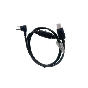 This durable USB programming cable features a sleek black matte finish and a straightforward design, perfect for connecting and configuring compatible walkie-talkie models such as PD405, PD416, PD485, TD500, TD510, TD520, TD560, TD580, BD500, BD506, and BD610. The cable includes a standard USB Type-A connector with a metallic interior and a small specialized connector with two silver pins, designed for reliable data transfer. Its flexible insulation and compact inline box ensure durability and ease of use during radio programming. Please note, this cable does not include programming software or USB drivers, serving solely as a functional connection for your radio devices.