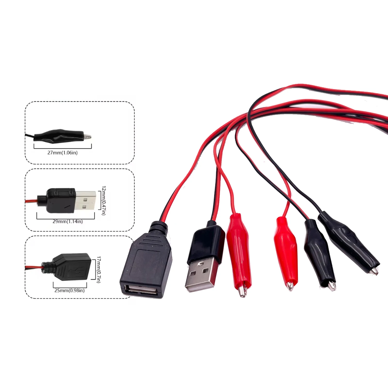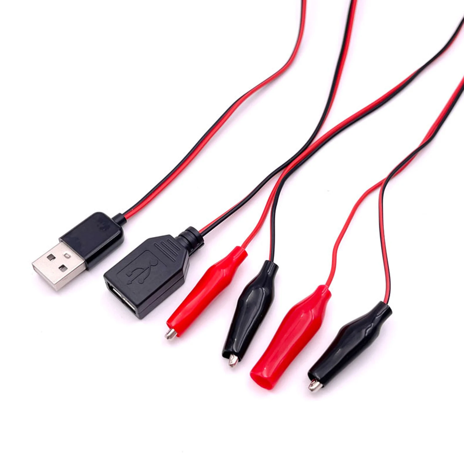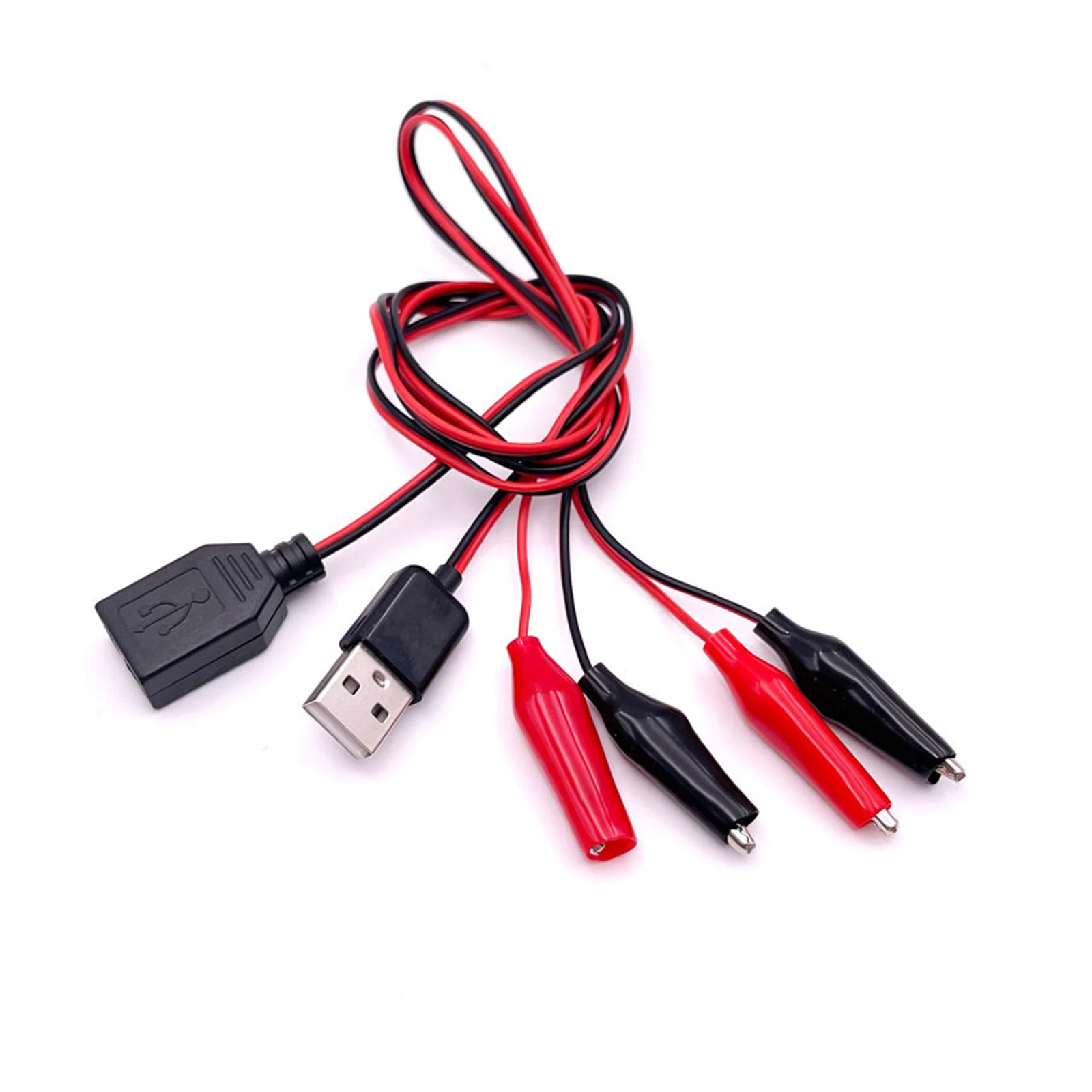 This set of two USB to alligator test clip cables measures 50 cm in length, featuring flexible, insulated PE wires with a USB Type-A male connector and two alligator clips—red for positive and black for negative poles. Available in configurations with two female clips, two male clips, or one of each, these durable, spring-loaded crocodile clamps have serrated grips for secure connections. Designed for electrical power supply testing and testing applications, they combine practical functionality with straightforward design, ensuring safe, reliable, and easy handling for all your electrical testing needs. Perfect for professionals requiring durable and precise testing tools.