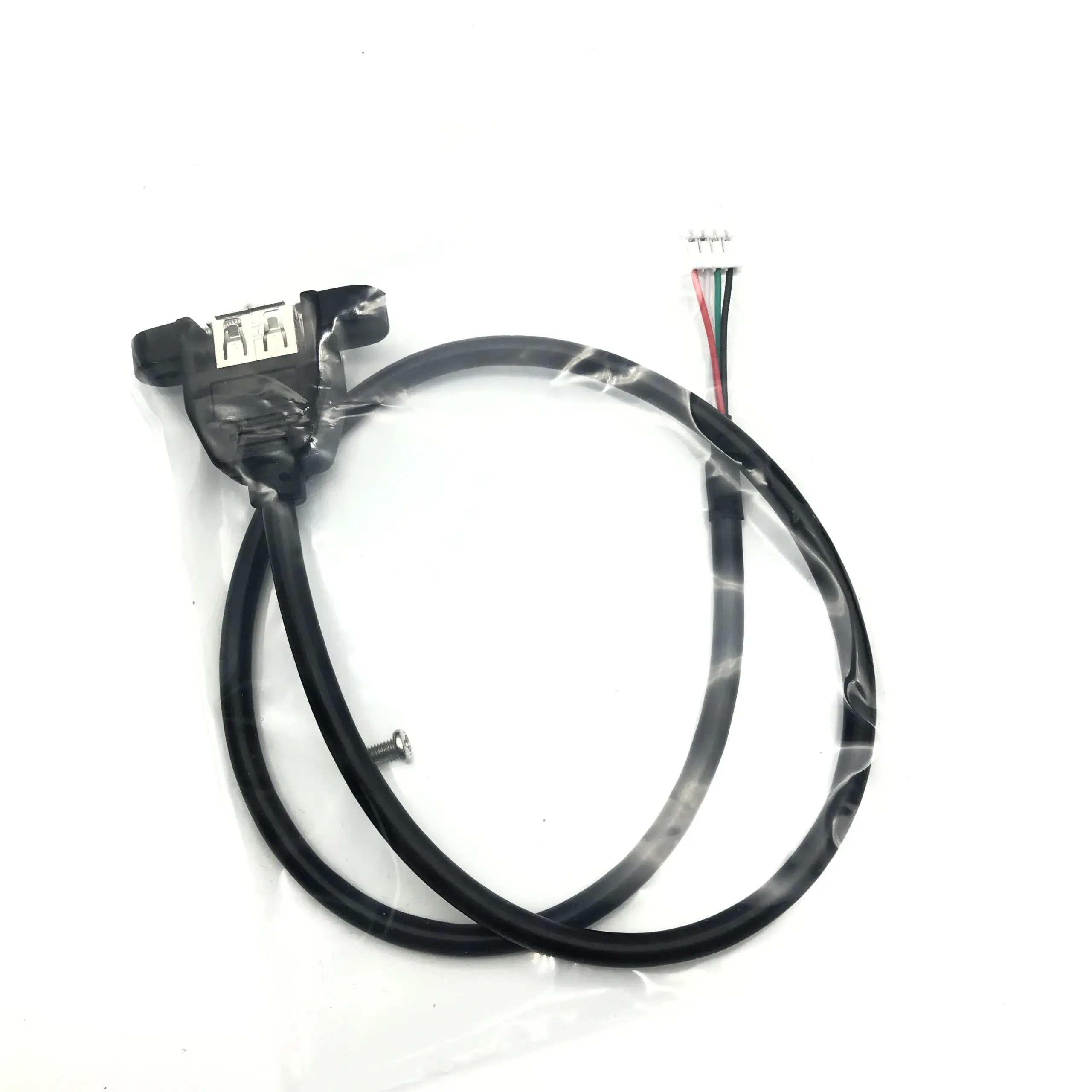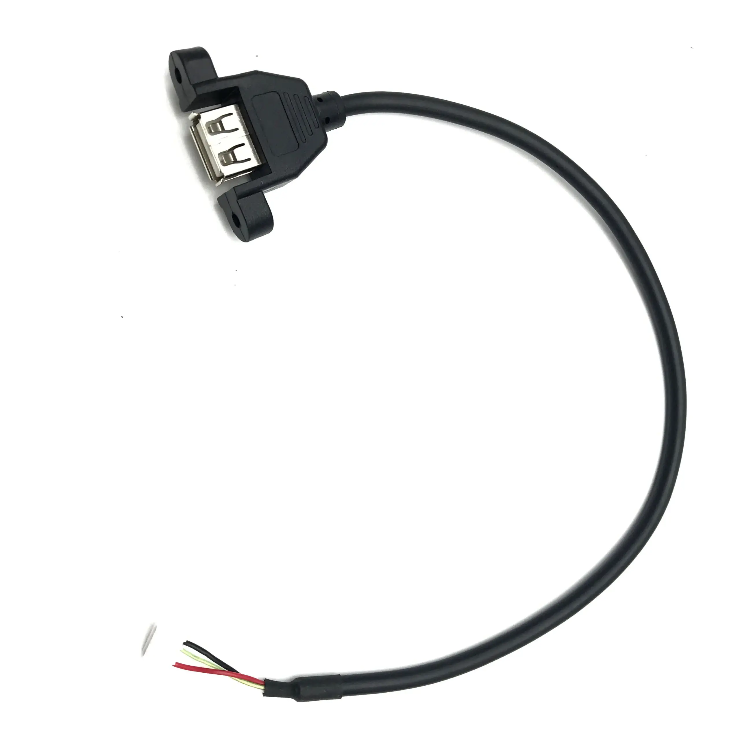 Imagine seamlessly connecting your power terminals to a USB port with this sleek, reliable adapter cable. Crafted with a durable black plastic housing, its rectangular design emphasizes functionality and modern industrial aesthetics. The USB Type-A female connector features a polished metal finish, ensuring durability and consistent performance. Adjacent to the connector, a practical mounting tab with two small screw holes enables secure installation onto surfaces or enclosures. From the housing extends a neatly organized cable, with color-coded wires—green, white, black, and red—inside a small white plastic connector, enhancing visual clarity and ease of wiring. Available in lengths of 30cm and 50cm, this adapter offers flexible options for various power supply configurations, blending utility with a sleek design to meet your technical needs effortlessly.