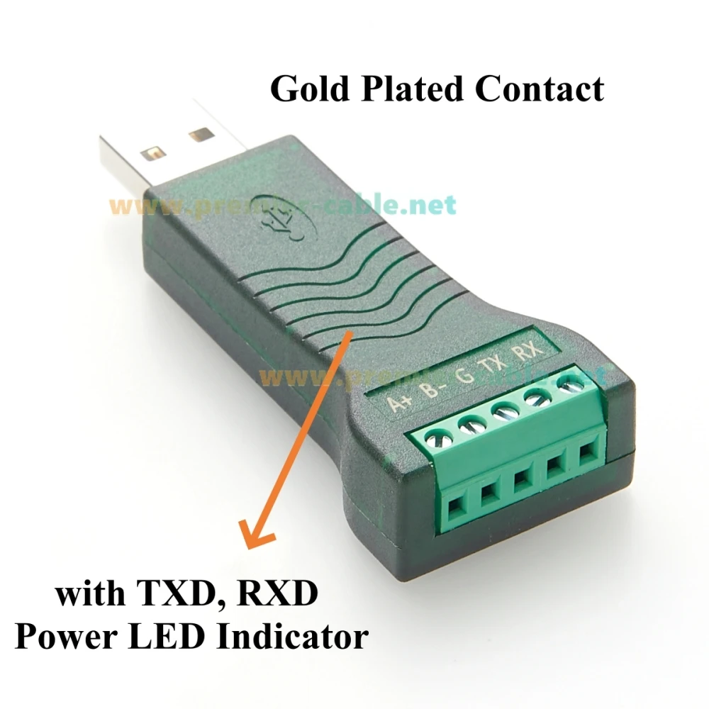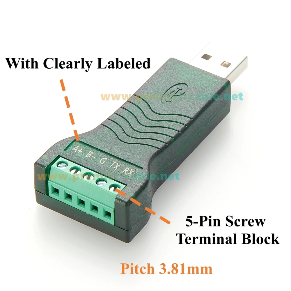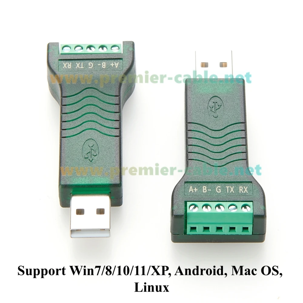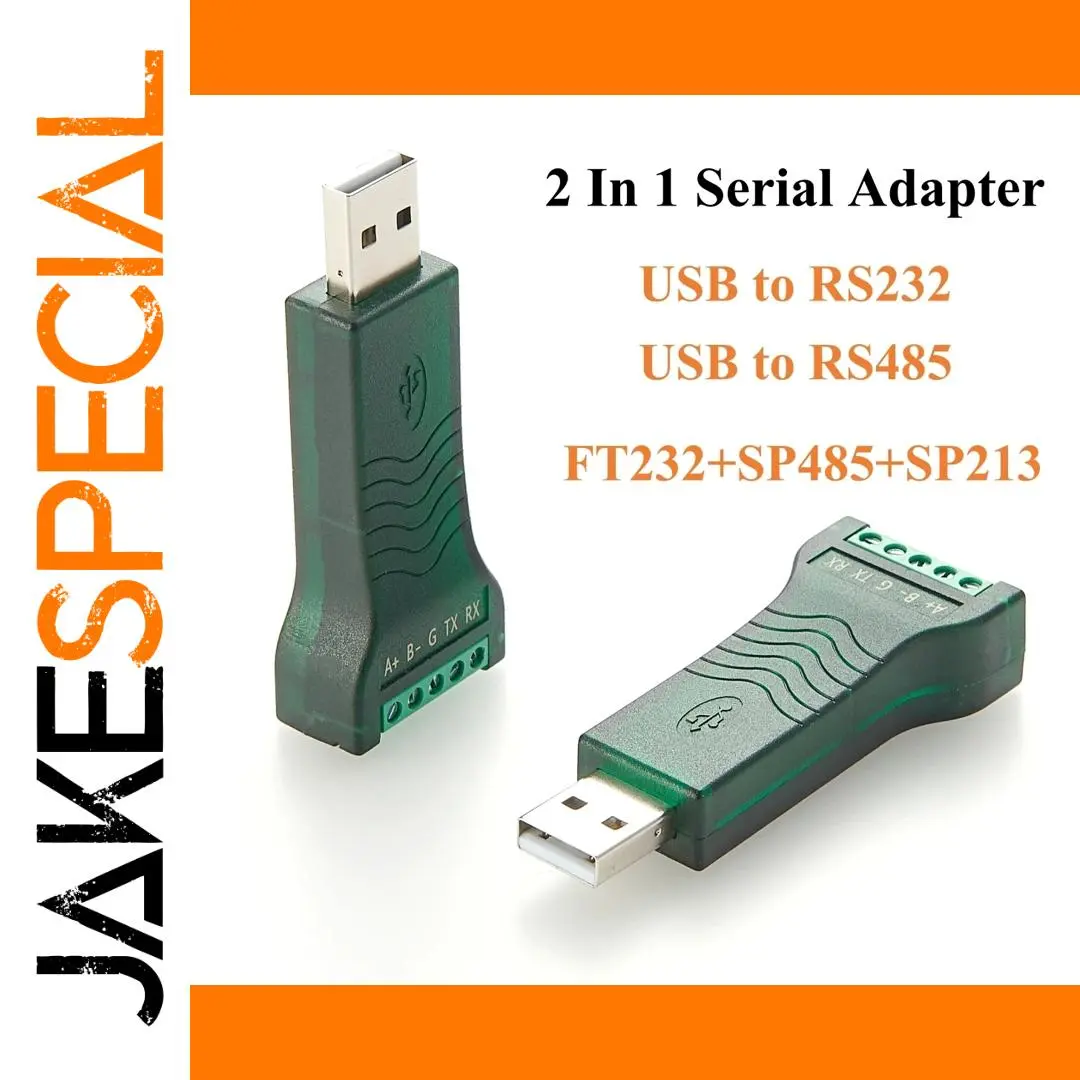 This compact and durable 2-in-1 USB to RS232/RS485 serial converter features a USB 2.0 A male connector and a 5-pin terminal block with a 3.81mm pitch, supporting reliable RS232 and RS485 communication via original FTDI FT232, SP485, and SP213 chipsets. It supports Windows 11/10/8/7/XP/Vista, Linux, Android (OTG), and MacOS with plug-and-play functionality, requiring no external power supply. Equipped with LED indicators for TXD, RXD, and power, the adapter boasts gold-plated contacts for enhanced durability. Ideal for industrial automation, PLCs, embedded systems, instrumentation, and data acquisition, it combines robustness with ease of use.