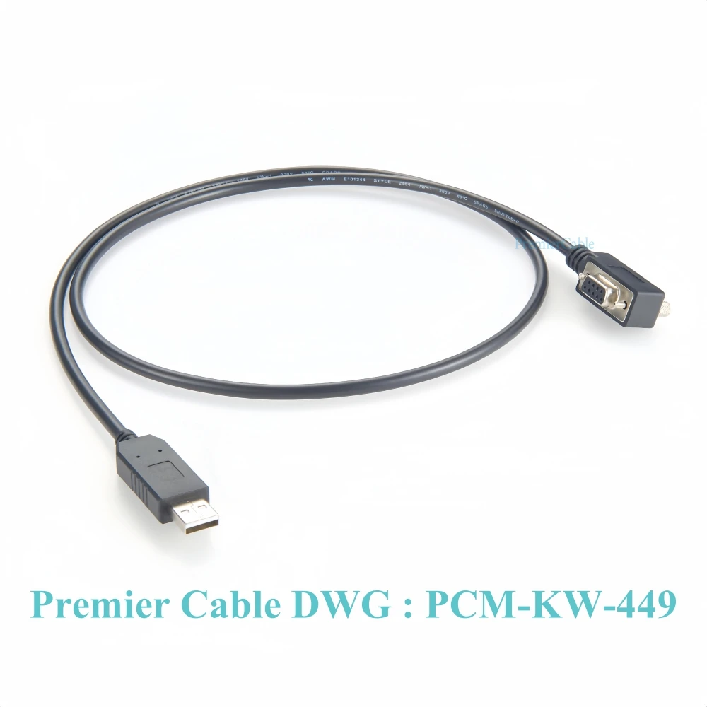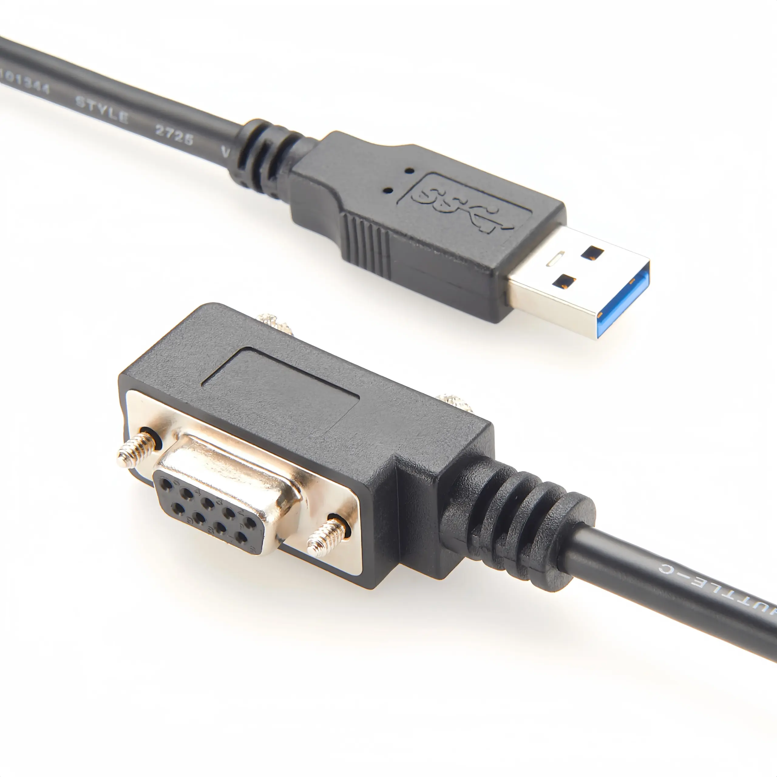 - Black plastic USB 2.0 male connector with a vibrant blue insert and embossed USB symbol; polished metallic DB9 shell with precise pin arrangements ensure secure connections.