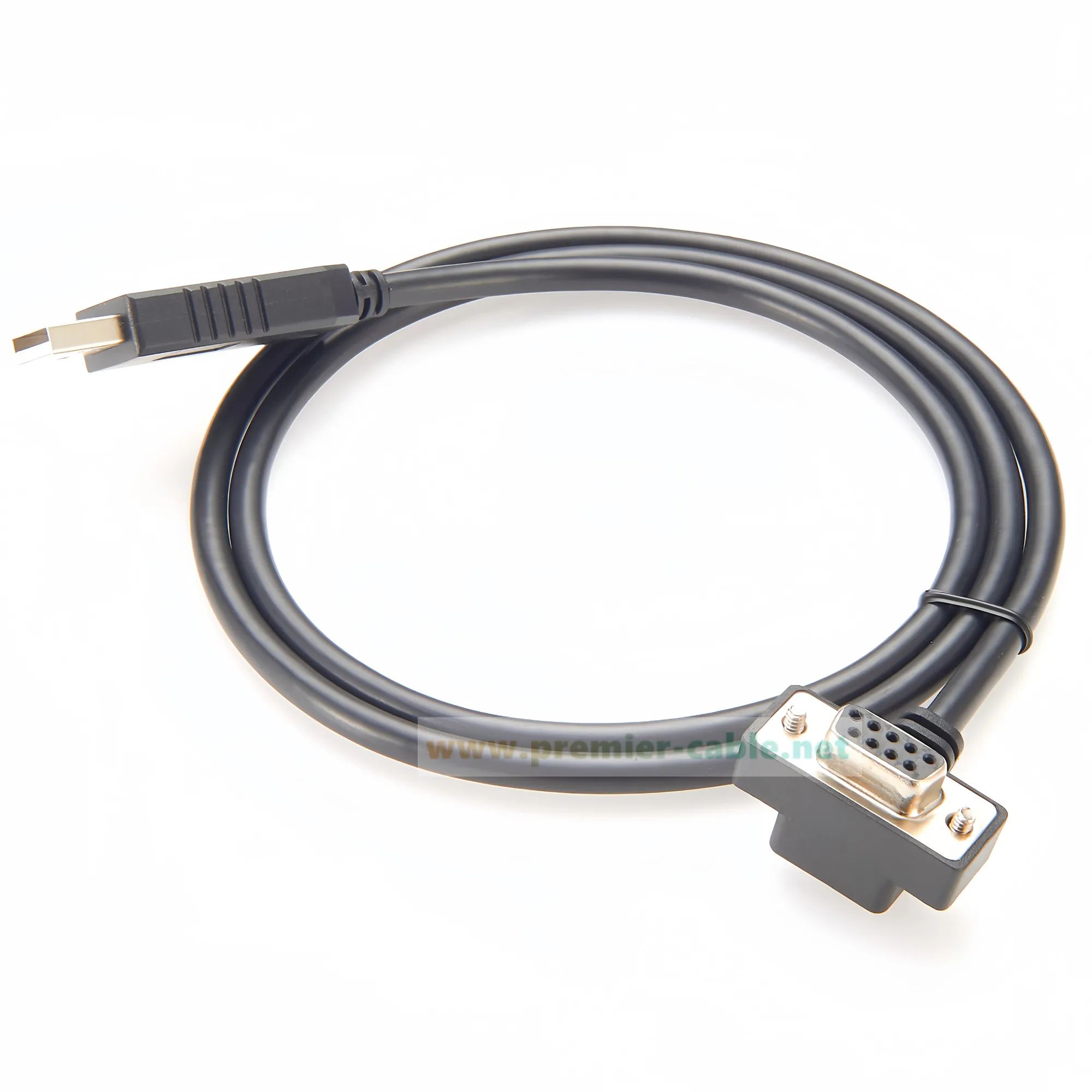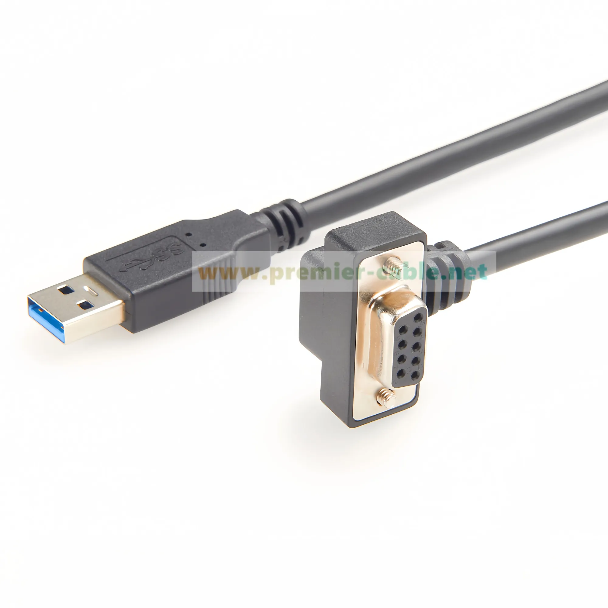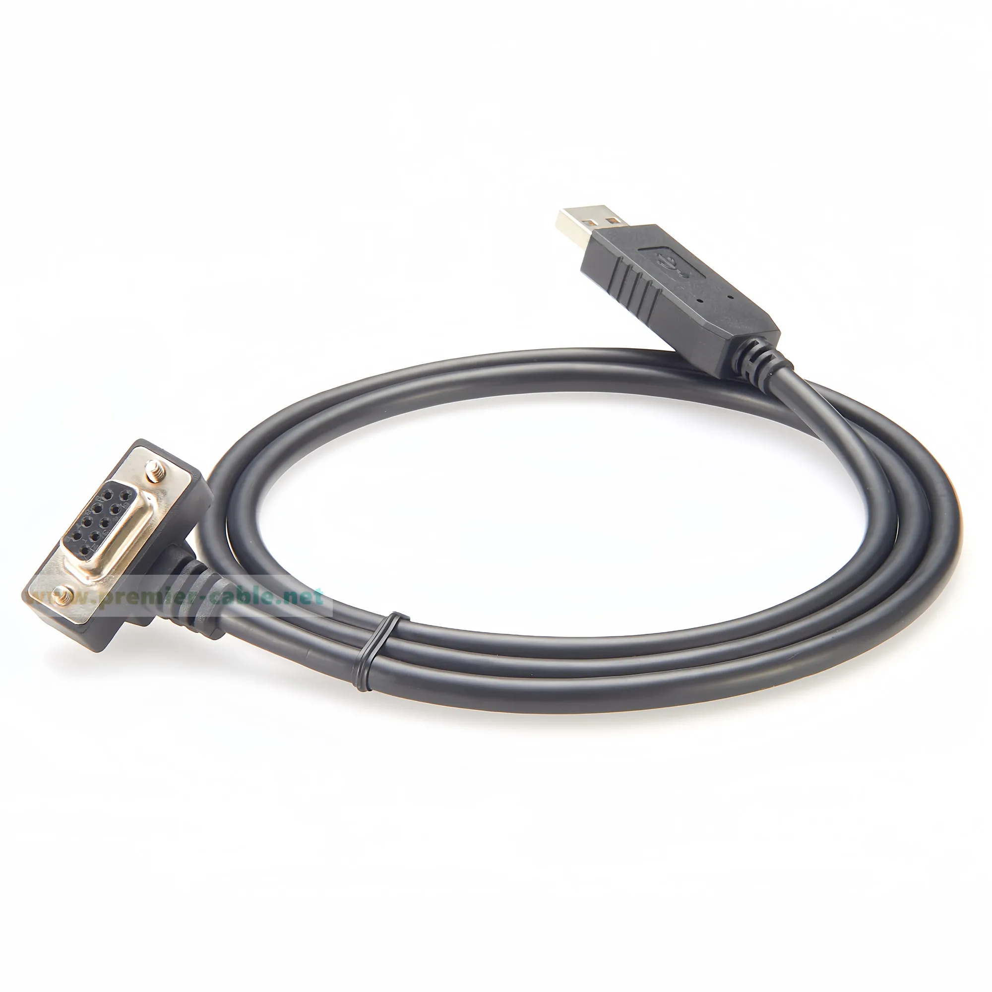 Experience seamless serial communication with this 1-meter USB to RS232 cable featuring a durable black PVC jacket and a sleek design. Equipped with a high-quality FTDI FT232RNL chip, it offers plug-and-play functionality for effortless connectivity without drivers. The cable connects a USB 2.0 Male port, housed in glossy black with a striking blue insert, to a DB9 Female connector encased in matte black with a polished metal shell, featuring gold-plated pure copper pins for corrosion resistance. Its unique 90-degree right-angle design ensures flexible, space-saving wiring in tight environments, making it ideal for industrial and professional applications demanding reliable, robust signal transmission.