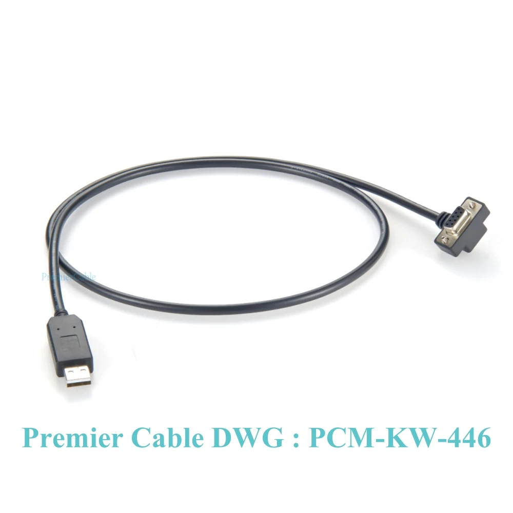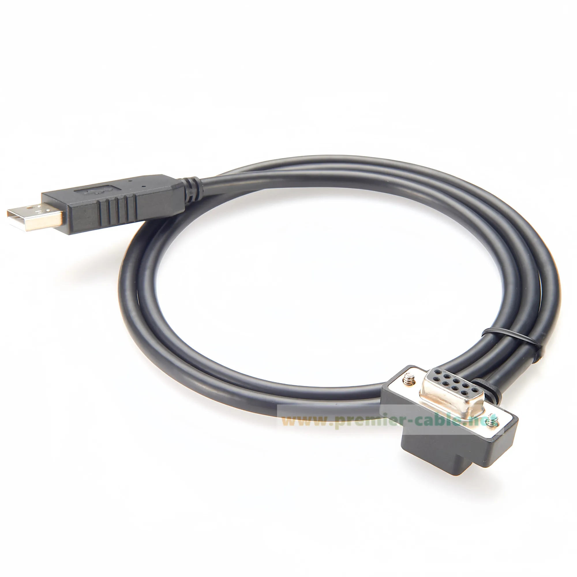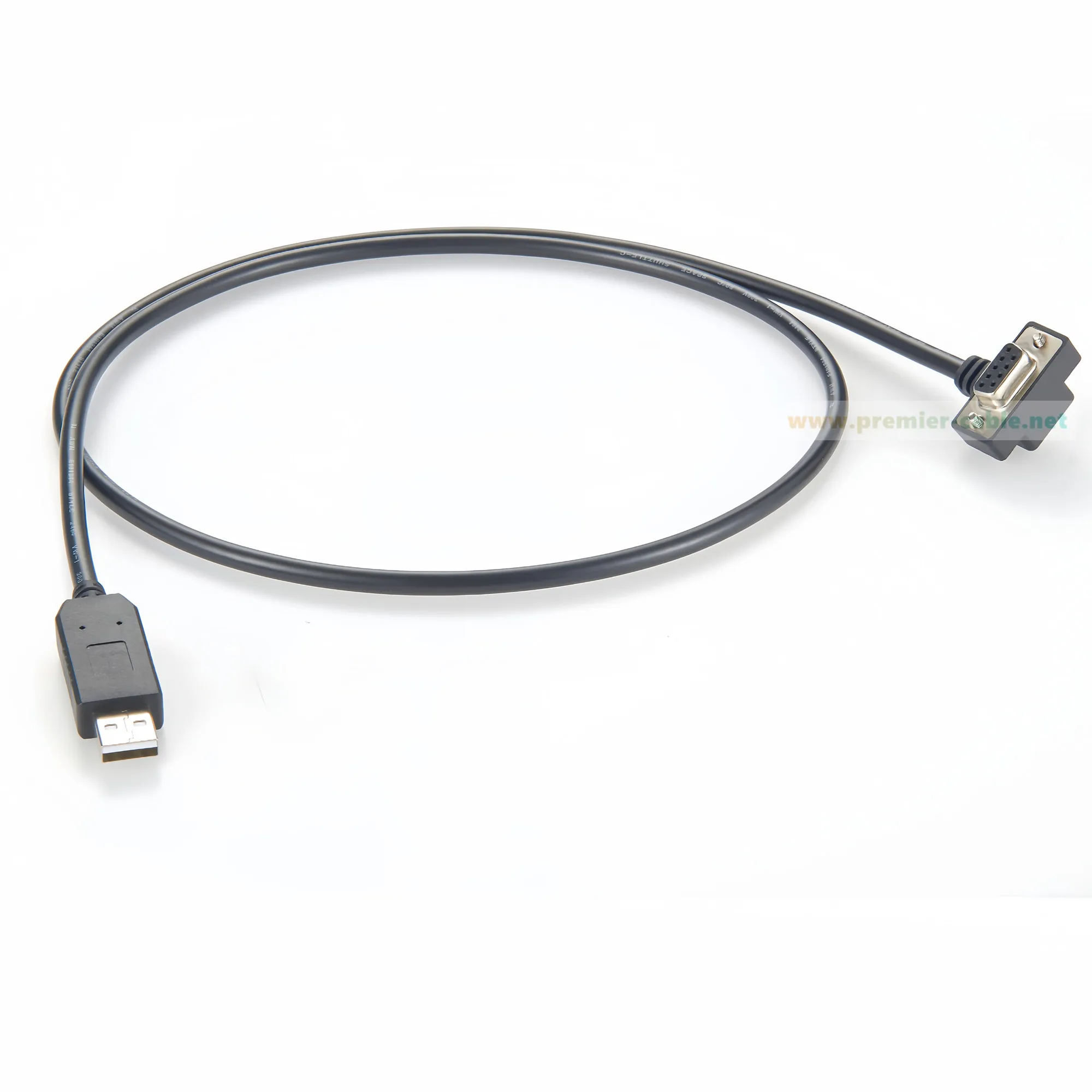 Experience seamless serial communication with this 1-meter USB to RS232 cable featuring a durable black PVC jacket and a sleek design. Equipped with a high-quality FTDI FT232RNL chip, it offers plug-and-play functionality for effortless connectivity without drivers. The cable connects a USB 2.0 Male port, housed in glossy black with a striking blue insert, to a DB9 Female connector encased in matte black with a polished metal shell, featuring gold-plated pure copper pins for corrosion resistance. Its unique 90-degree right-angle design ensures flexible, space-saving wiring in tight environments, making it ideal for industrial and professional applications demanding reliable, robust signal transmission.