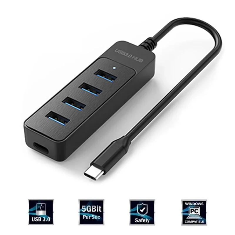 Enhance your workspace with this sleek USB Type-C 5Gbps High-Speed USB 3.0 Hub, featuring five USB-A ports with vibrant blue interiors for easy connection to hard drives, mice, keyboards, and other devices. Its modern, rectangular design is crafted from durable dark gray or black plastic with a subtle textured finish, seamlessly complementing any modern laptop or desktop setup. The hub supports data transfer speeds up to 5Gbps, ensuring quick and reliable performance for all your peripherals. Compact and practical, this hub is an essential accessory for expanding connectivity and optimizing your productivity with a stylish, streamlined look.