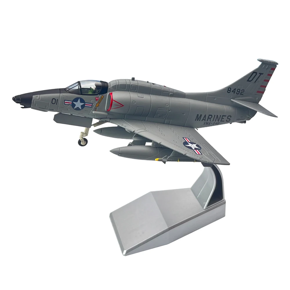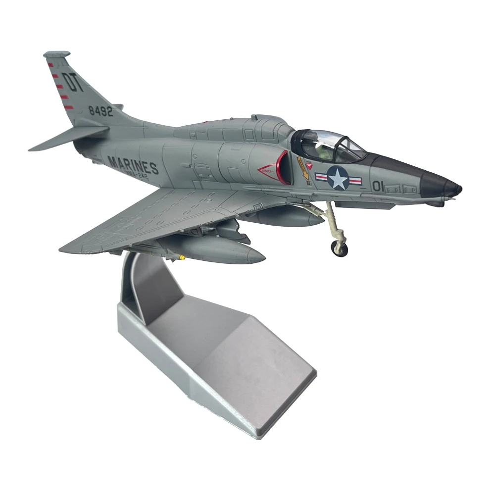 Experience the precision craftsmanship of this detailed 1:72 scale diecast model of the United States Marine Corps A-4 Skyhawk attack aircraft. Expertly crafted from high-quality alloy with engineering plastic tires, this model captures the sleek, aerodynamic fuselage in shades of gray, highlighted by meticulously applied markings, insignias, and panel lines for exceptional realism. The pointed nose cone is painted black, contrasting beautifully with the transparent cockpit canopy that reveals a finely detailed interior. The sharply pointed, downward-angled wings feature visible control surfaces, while the tail fin bears striking red markings with the number “8492” and “OT,” adding authentic vibrancy. Designed for collectors and military enthusiasts, this model exudes craftsmanship and authenticity, making it a distinguished addition to any display or collection.