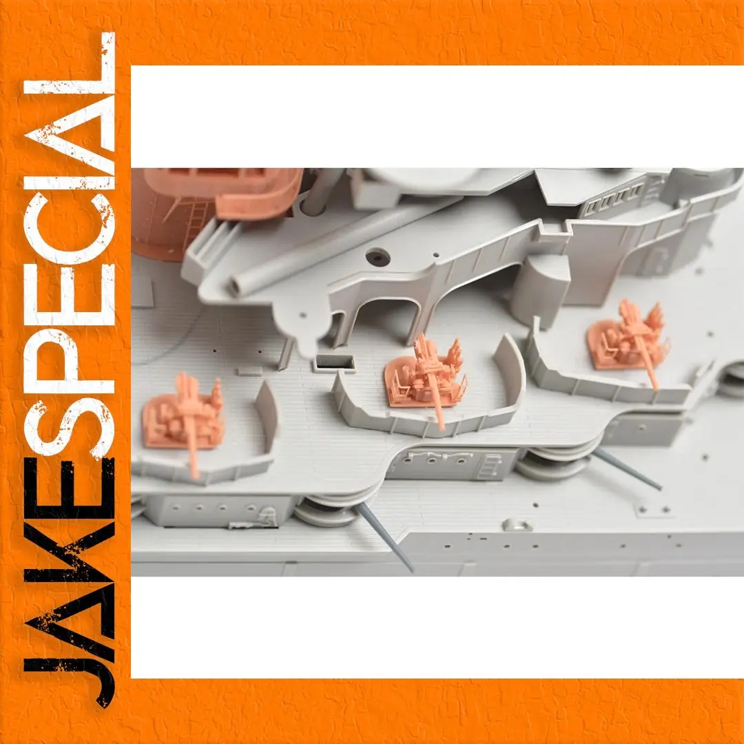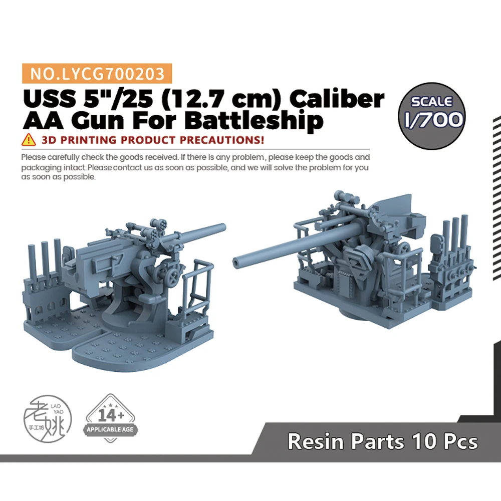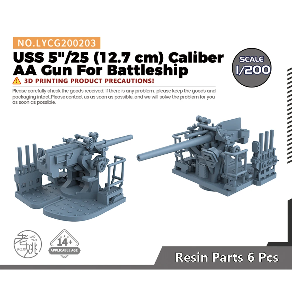 The Yao’s Studio LYCG203 model upgrade kit enhances the USS 5″/25 (12.7 cm) caliber anti-aircraft gun, featuring intricately detailed resin gun models in a light orange color with textured surfaces that replicate real naval artillery. This set includes four uniquely designed platforms with dual barrel extensions and robust mounts showcasing elevation mechanisms and protective barriers. They rest on a darker gray base that emulates the ship’s deck, embellished with structured patterns resembling planking and circular fittings for enhanced realism. Compatible with scales 1/700, 1/350, 1/200, and 1/144, this kit offers a high level of detailing for model battleship enthusiasts.