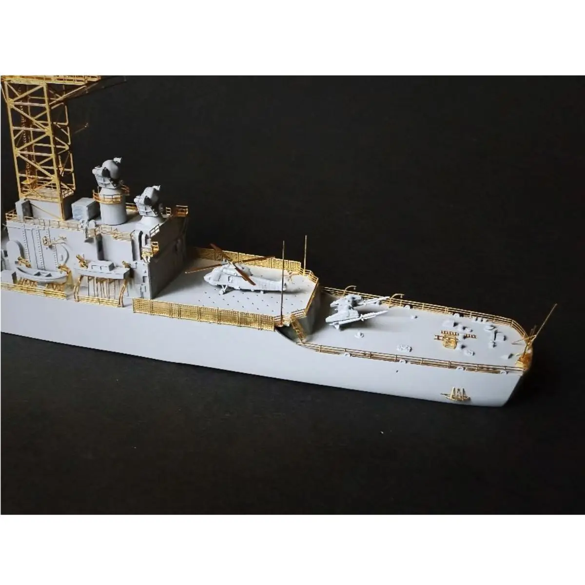 Bring to life the striking design of the USS Truxtun class guided missile cruiser with this detailed 1/700 scale plastic model kit. Crafted with precision, this assembly offers a sleek, elongated hull painted in crisp white, accentuated by bold gold-colored superstructure towers that create a visually stunning contrast. The intricate details include multiple decks, antennas, radar dishes, and defense turrets, providing a realistic and accurate miniature of the real vessel. The finely molded surface lines reflect the ship's complex structural features, capturing its streamlined elegance and technical sophistication. As you assemble and display this model, you will appreciate the craftsmanship and attention to detail that make this a perfect addition to any collection or display dedicated to naval military history.