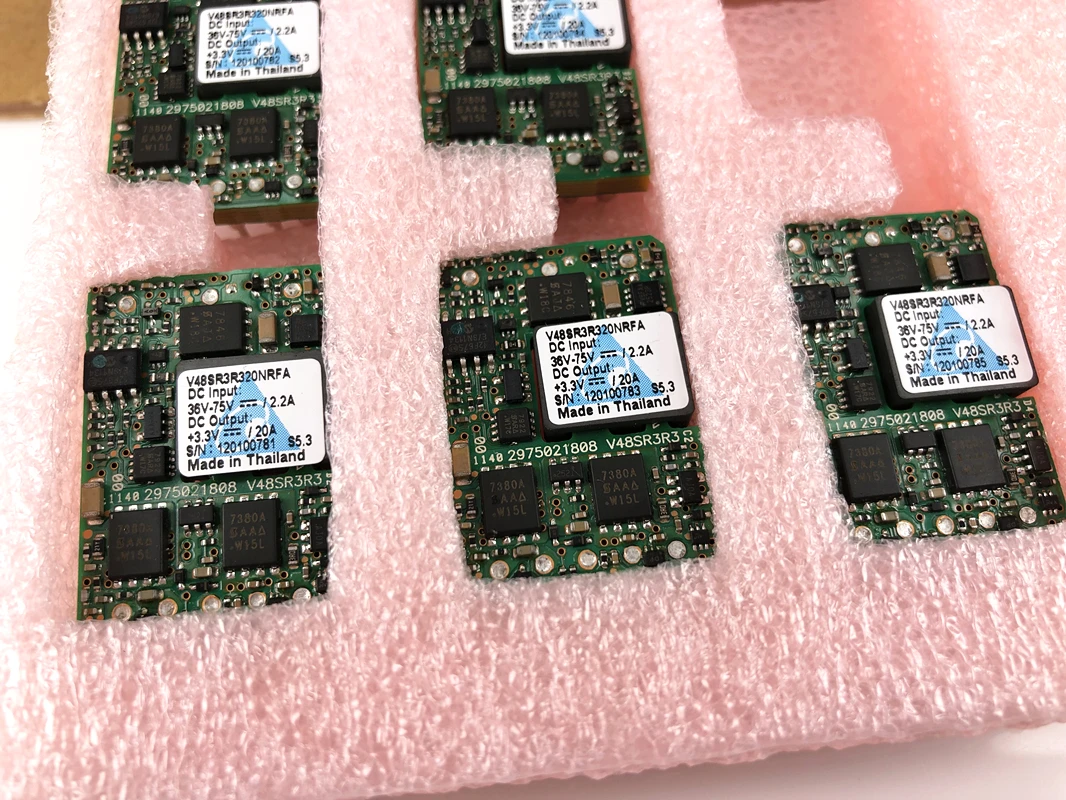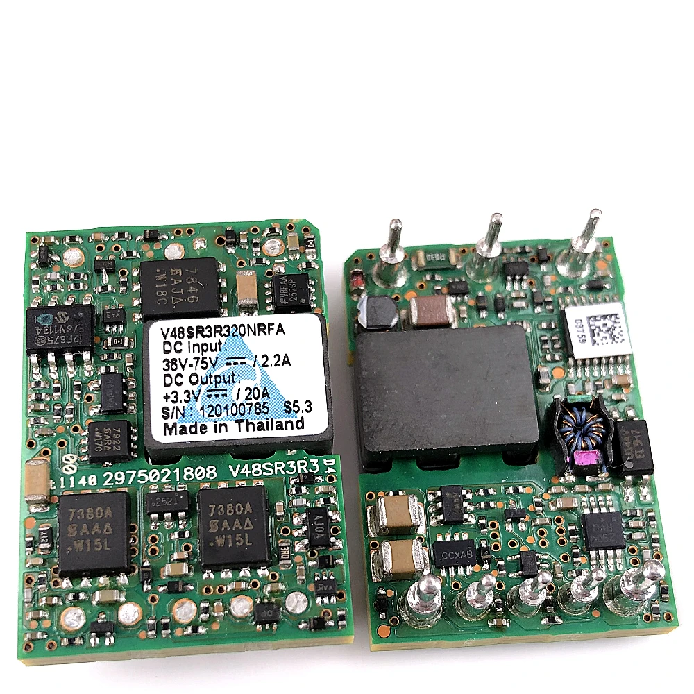 Experience reliable power conversion with the original V48SR3R320NRFA isolated DC/DC converter module, designed for high-quality electronic applications. This new, compact module features a vibrant green PCB densely populated with black and metallic components, including power regulation chips, resistors, capacitors, and a relay or inductor, all precisely arranged for optimal performance. Its clean, organized layout and crisp white label highlight key specifications, ensuring clarity and trust. Built for durability and efficiency, this module provides electrical isolation with unspecified input and output ranges, making it suitable for demanding electronic systems where dependable power management is essential.