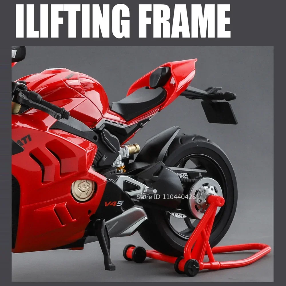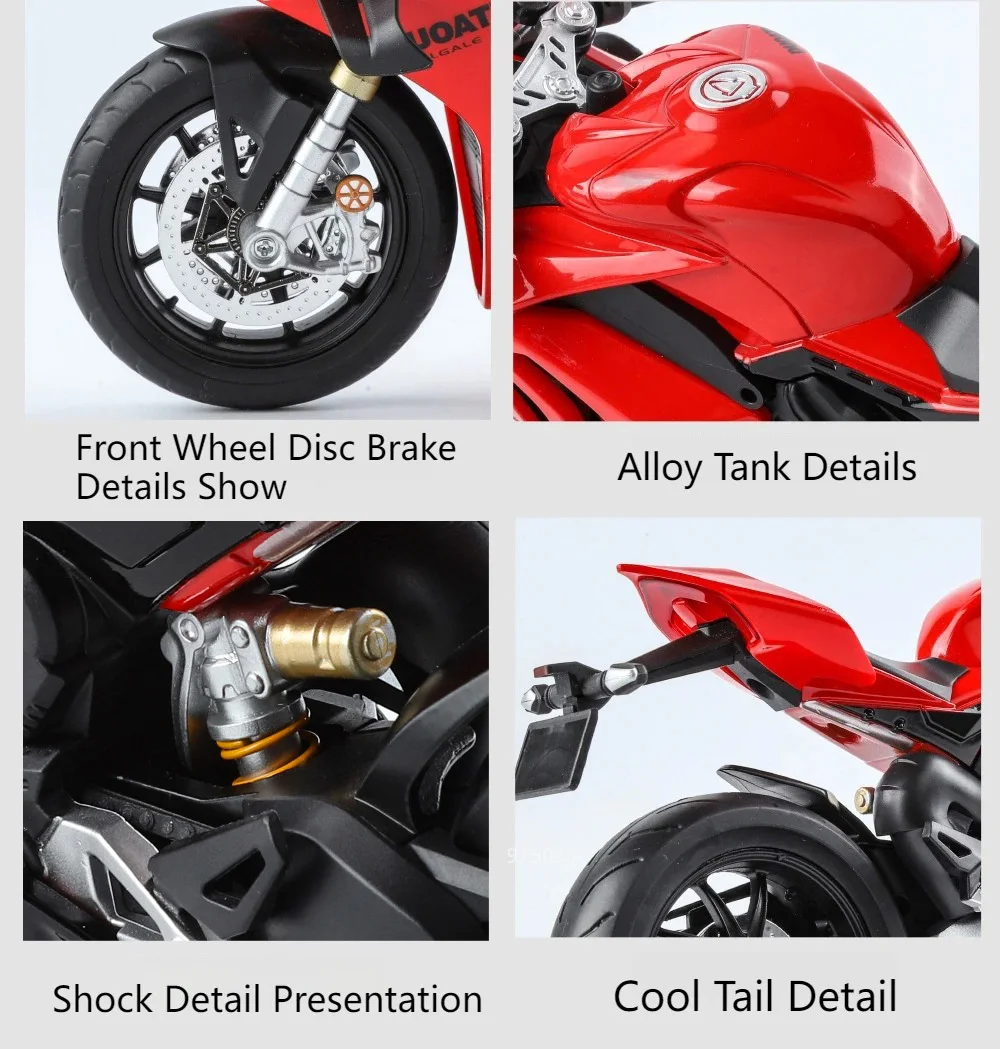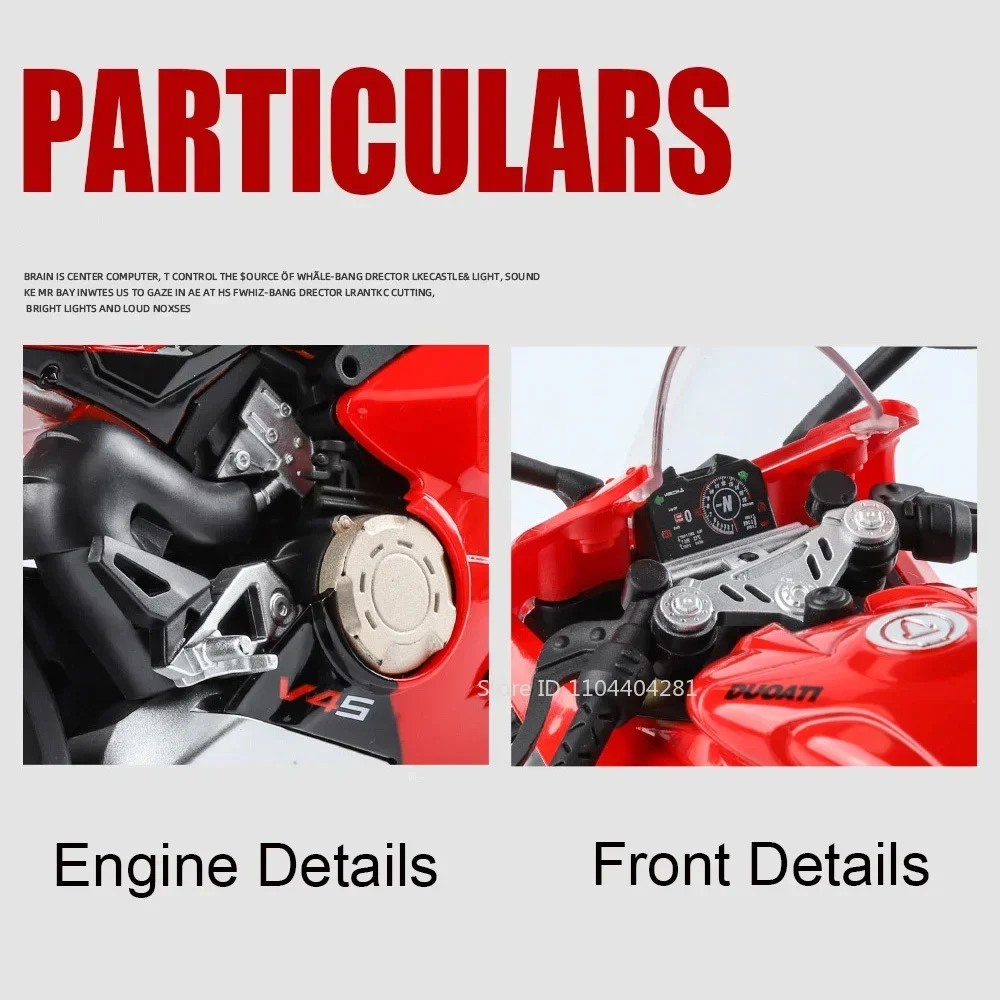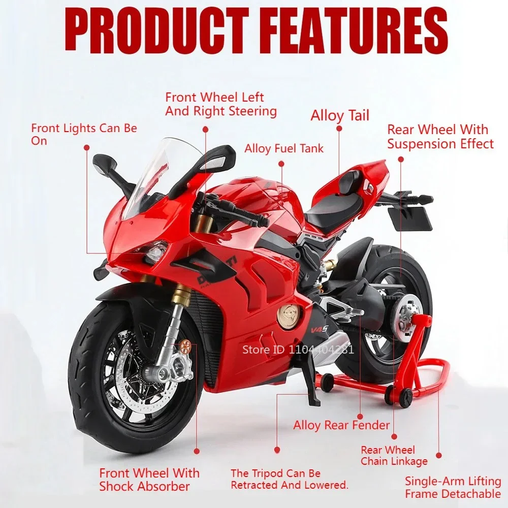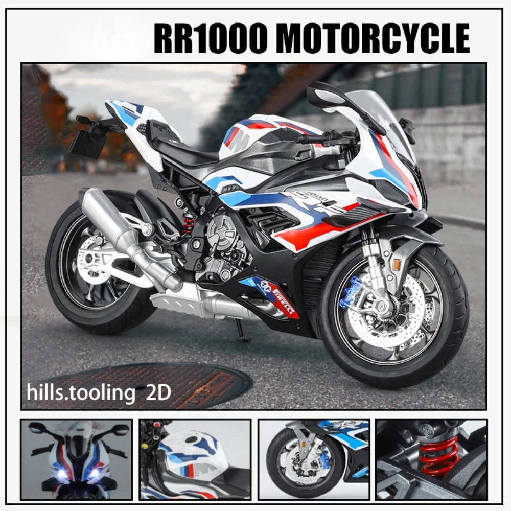 Experience the thrill of high-performance racing with this detailed 1:9 scale alloy motorcycle model, available in vivid V4S Red and sleek RR1000 White. Crafted with a durable diecast metal body, plastic chassis, and rubber tires, this model measures approximately 23 x 9.5 x 13 cm for the V4S and 25 x 9 x 13 cm for the RR1000. It features realistic moving parts, including opening doors, a pull-back mechanism, and shock absorption. With integrated lighting and music, it offers an engaging display for collectors or as a gift. Suitable for enthusiasts aged 14 and above, this striking model combines technical precision with aesthetic appeal for an immersive experience.