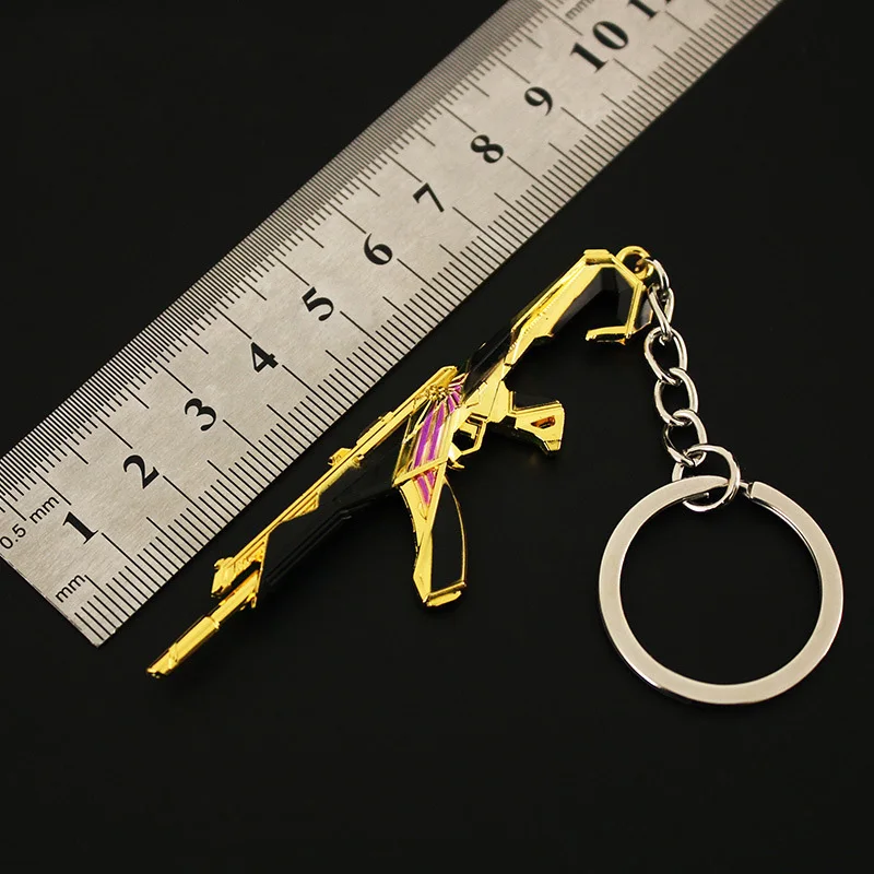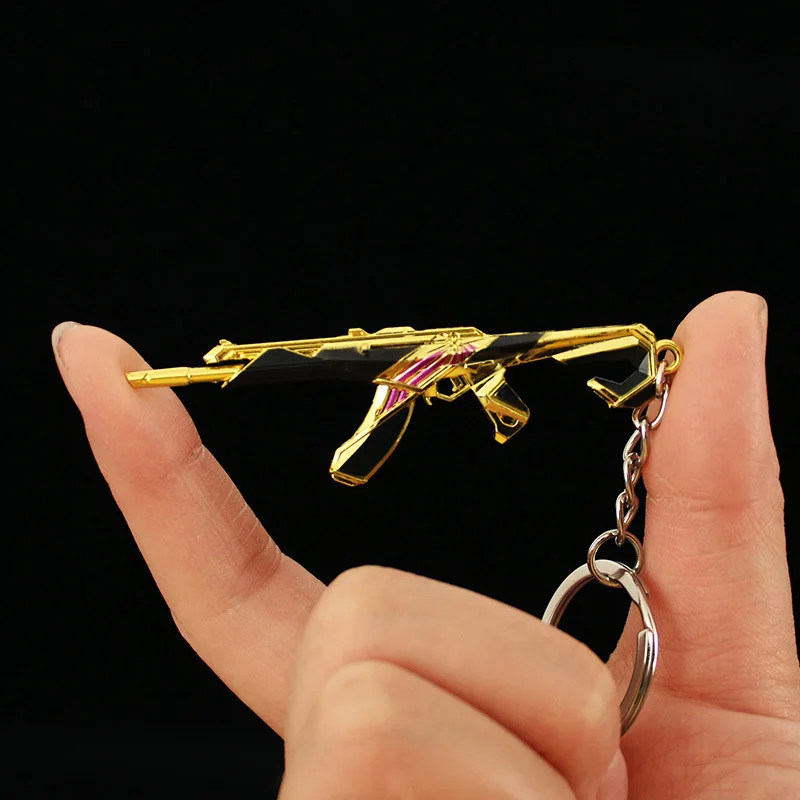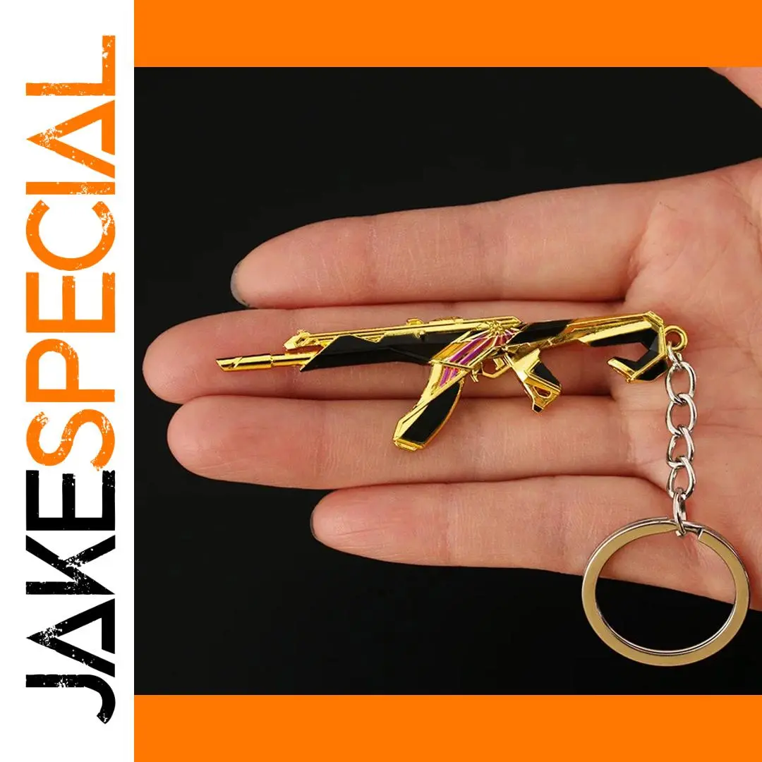 Experience the thrill of the Valorant Reaver Vandal with this meticulously crafted keychain, measuring approximately 8 cm. Made from durable zinc alloy, this trendy accessory showcases a sleek geometric design inspired by the futuristic assault rifle. The dominant gold finish is contrasted by black accents, enhancing its luxurious and tactical appearance. The subtle iridescent streaks add a holographic shimmer, giving the piece a modern, high-tech vibe. Designed with textured, raised details, it offers a tactile feel that’s perfect for fans and collectors alike. Whether you attach it to your bag, keys, or display it as a gaming collectible, this keychain combines style, craftsmanship, and fandom seamlessly.