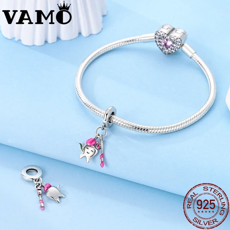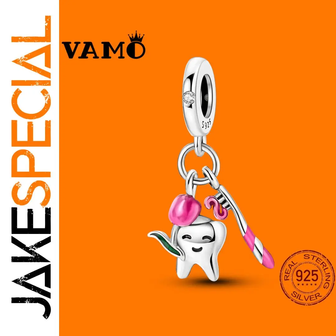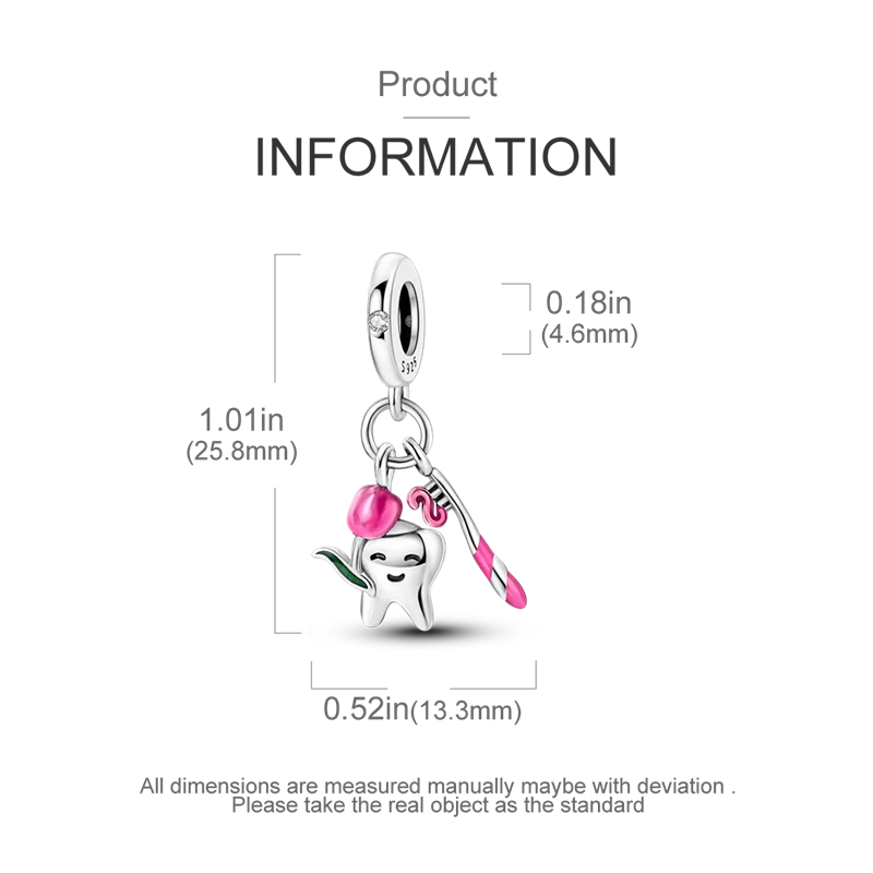 Imagine adding a playful yet elegant touch to your jewelry collection with this beautifully crafted charm bead. Made from high-quality 925 sterling silver, it features a smooth, nugget-shaped design that is both modern and organic. The polished surface reflects light beautifully, enhancing its sophisticated appearance. The charm showcases a whimsical tooth or toothbrush figure, accented with a pink bow and a green leaf, giving it a cheerful, youthful vibe. A small, clear gemstone adds a subtle sparkle, making it the perfect piece for personalizing your bracelets or necklaces. Suitable for daily wear or special moments, this piece seamlessly combines fun and refinement, inspiring you to create unique jewelry that reflects your personality.