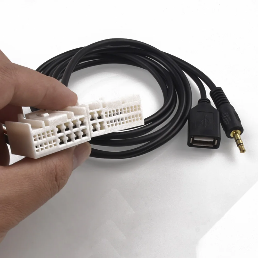 Imagine effortlessly connecting your favorite external audio source to your car’s audio system with this sleek and durable adapter. Designed with a black metal and plastic finish, it combines modern aesthetics with practicality. The 3.5mm AUX interface is gold-plated, ensuring optimal signal transfer for clear, high-quality sound. Its flexibility allows for easy coiling, making it convenient for storage and use on the go. The white rectangular connector with precisely arranged small square holes provides a clean, organized look that guarantees a secure fit into compatible vehicle head units. The multicolored wires extending from the connection points add visual interest and reflect connectivity and technical precision, making this adapter a reliable, high-performance addition to your vehicle's entertainment system.