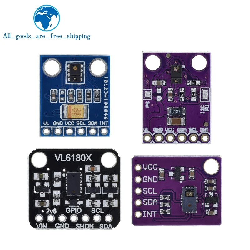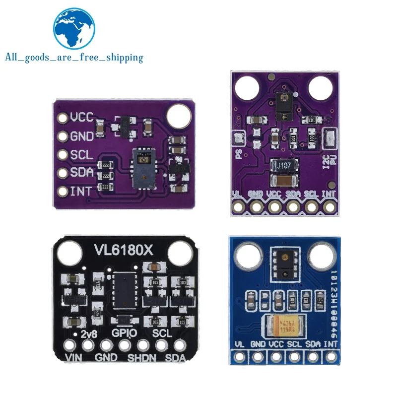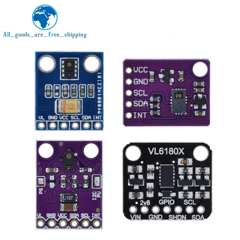 - Includes optical ranging sensors VL6180X, VL6180, APDS-9930, and APDS-9960 for precise distance measurement and proximity detection.