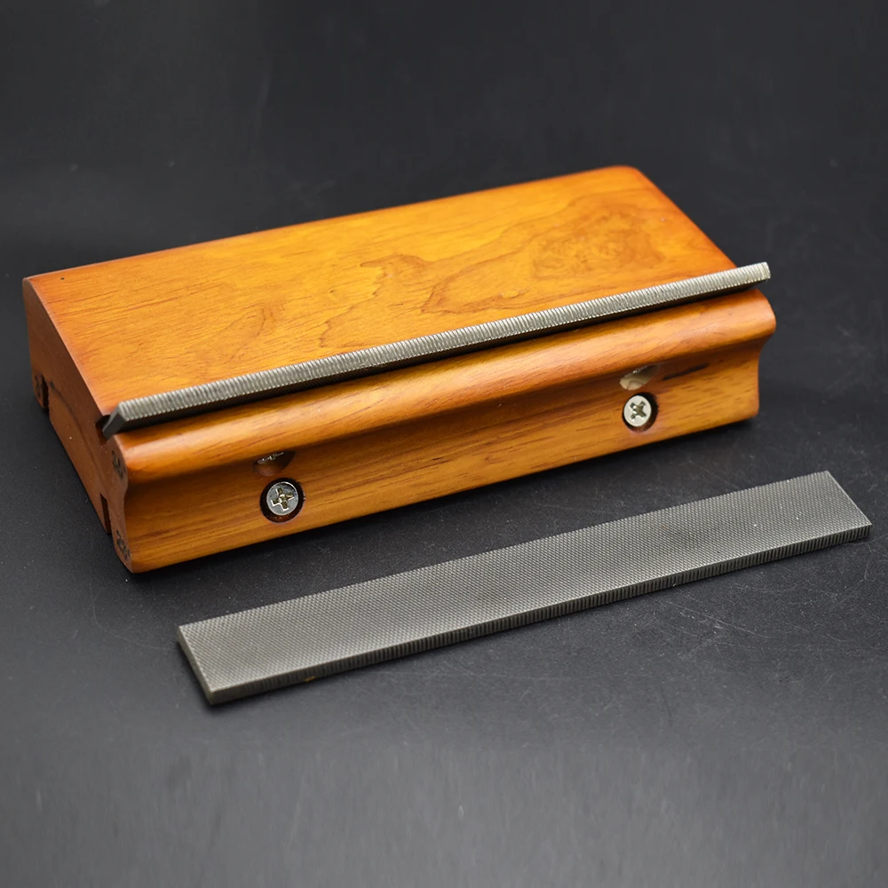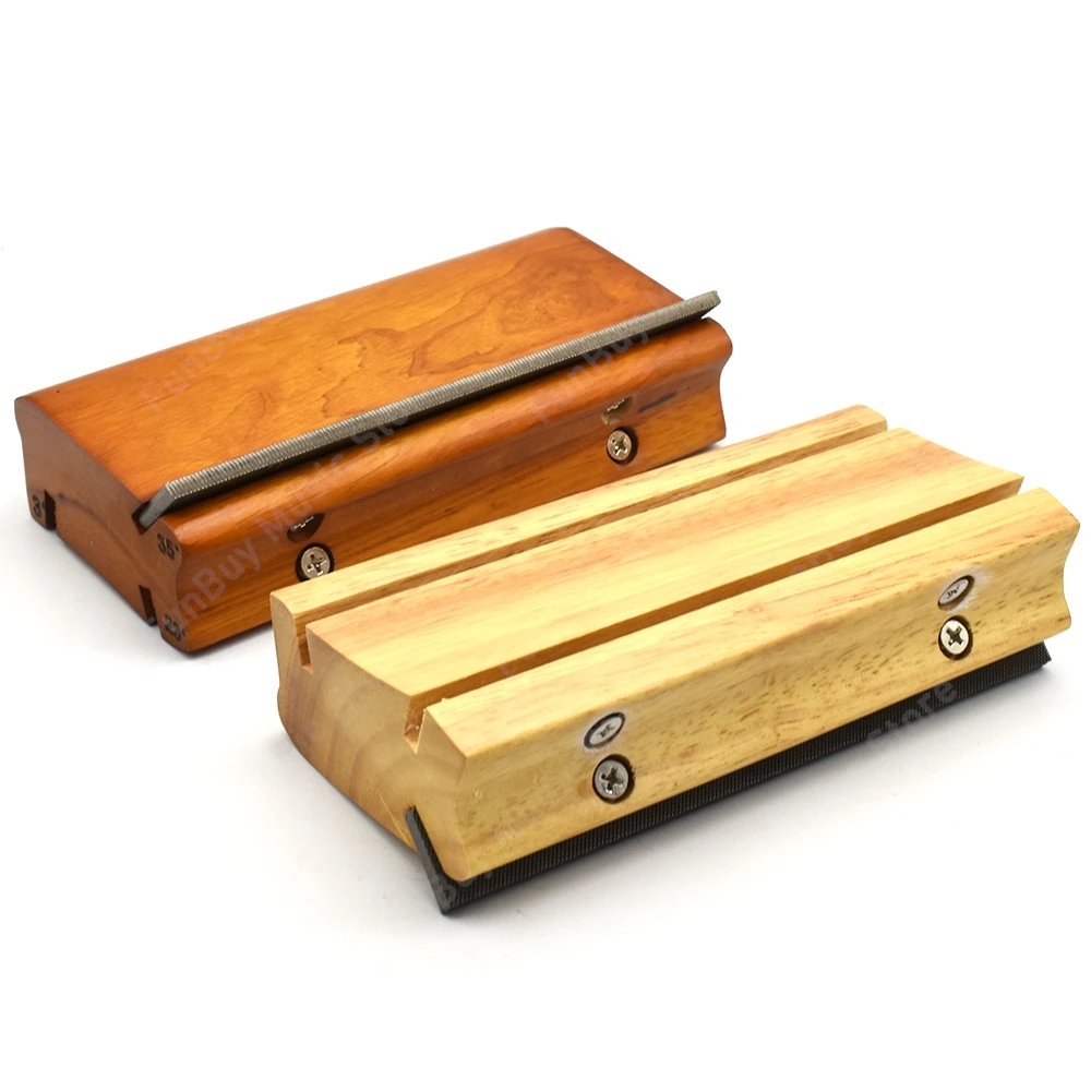 - Technical specifications: high carbon steel filing surface; notched sides for grip; lightweight rubberwood body; 152mm length; 72mm width; 30mm height; adjustable screws included for precise angle control.
