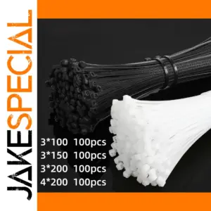 Enjoy versatility and reliability with this set of 100 self-locking nylon cable ties in black and white, available in sizes 3x100mm, 3x150mm, 3x200mm, and 4x200mm. Crafted from durable nylon, these ties feature a secure self-locking mechanism for quick, firm fastening in various applications. Their sleek design with fine ridges and rounded heads offers both functionality and a clean aesthetic. Perfect for organizing cables, securing items, or DIY projects, this set provides a wide size range to meet diverse needs. Each package contains 100 pieces, with a slight allowable variance of ±2%, ensuring you’ll always have the right length at hand for your projects.