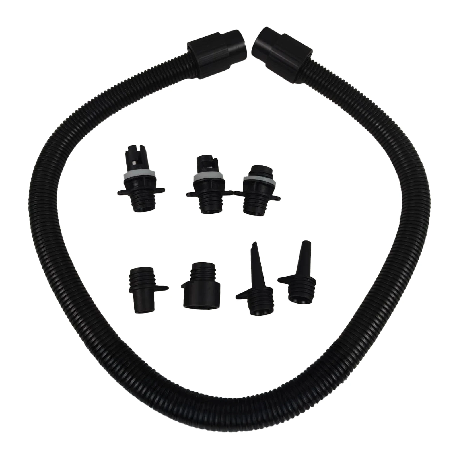Experience effortless inflation of your inflatable gear with this highly durable black paddle board pump adapter hose. Designed for versatility, it features a flexible, ribbed construction that ensures easy handling and longevity. The sleek cylindrical connector creates a seamless fit with electric air pumps, while reinforced ridges provide extra strength during use. The kit includes seven nozzles, each tailored to fit various valve types such as conical, clip-on, and different diameters, making it compatible with stand-up paddle boards, kayaks, and other inflatables. Whether you're out camping, at the beach, or enjoying outdoor adventures, this adapter hose enhances your inflating experience by offering reliable performance in water or outdoor environments.