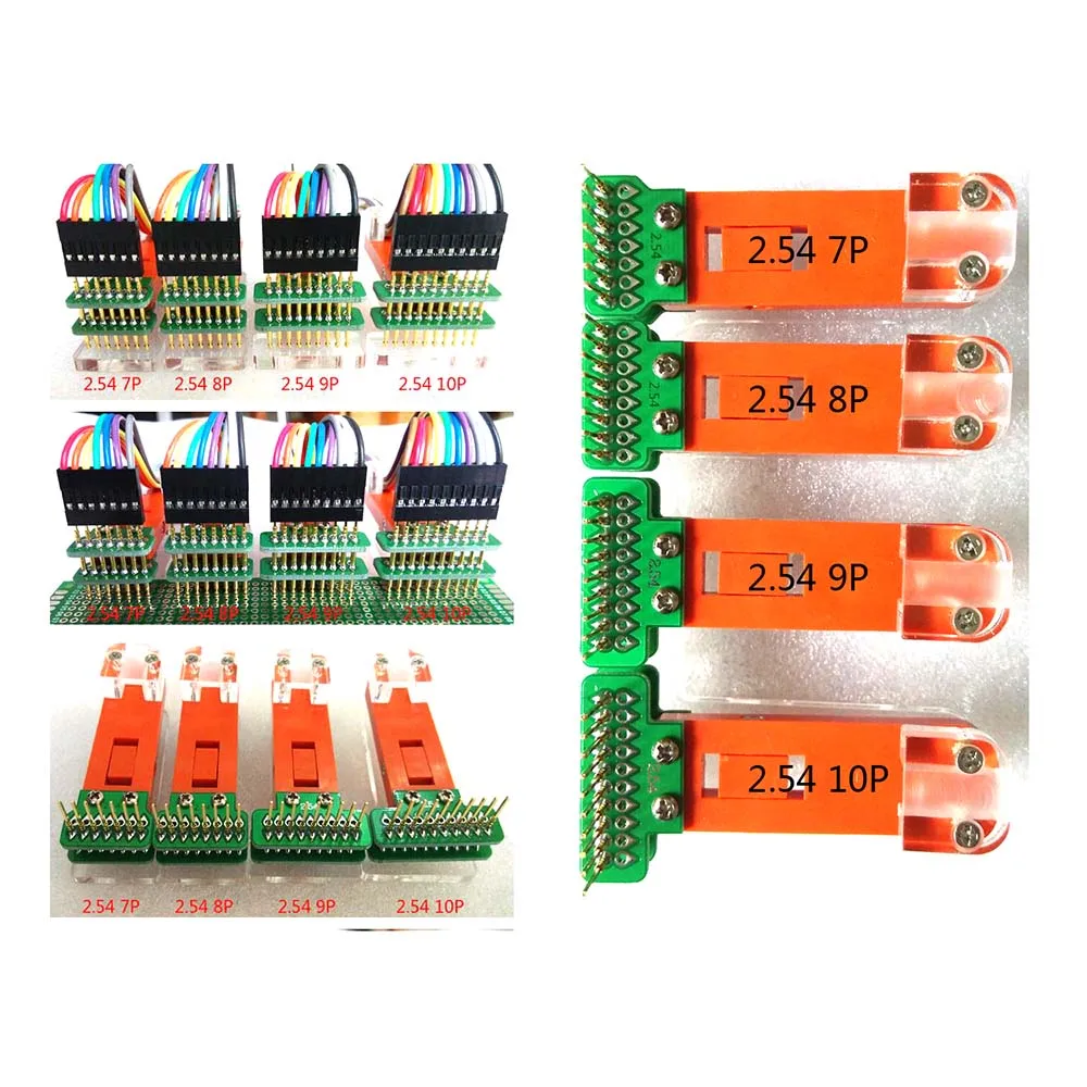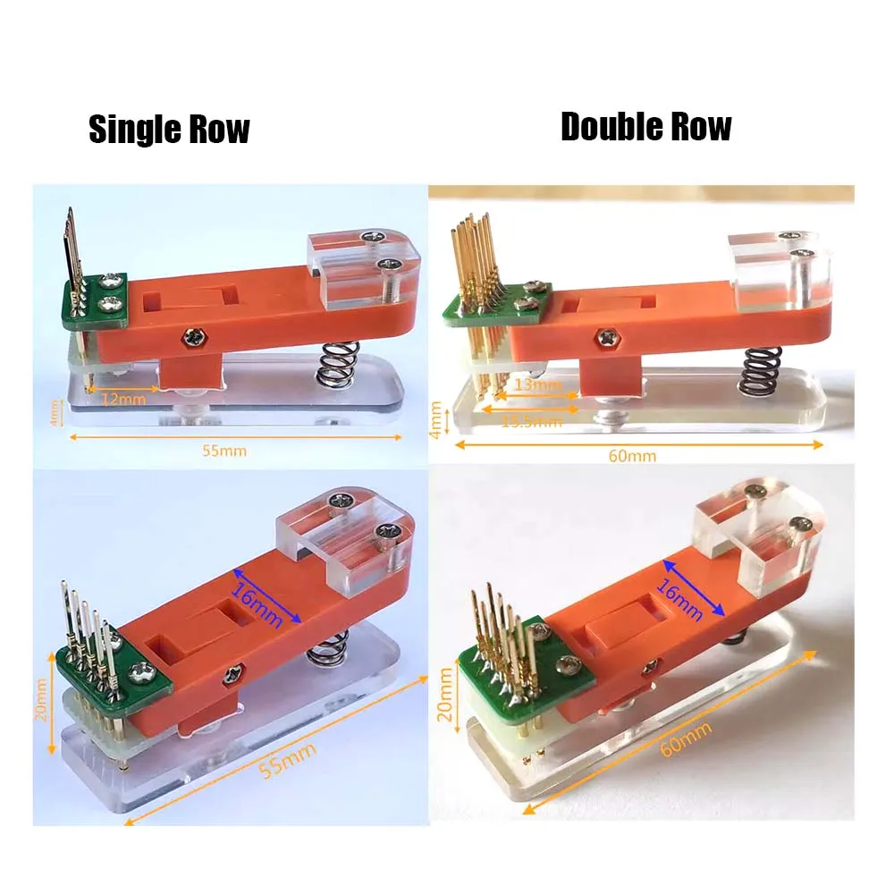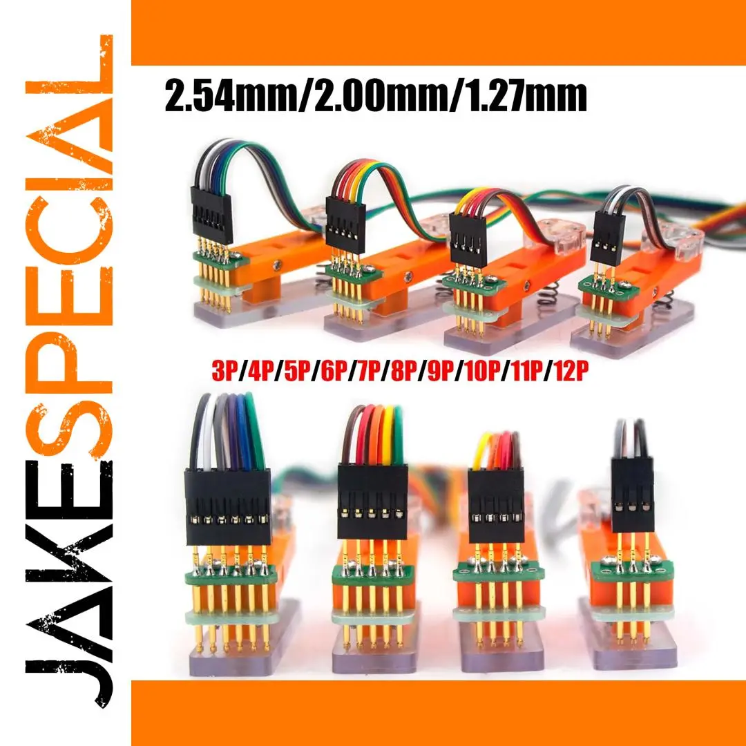 Experience precision and reliability with this high-quality test stand PCB clip clamp fixture. Designed for downloading, programming, and burning tasks, it features adjustable spacing options of 1.27mm, 2.00mm, and 2.54mm, accommodating a wide range of PCB configurations. Suitable for both single and double-row arrangements, it supports pin counts from 3P to 10P—perfect for various project needs. The fixture’s orange plastic housing provides a modern, sturdy appearance, with gold-plated pogo pins offering excellent conductivity and durability. The neatly organized, multicolored wires enhance clarity and ease of use, connecting securely to the green circuit board and black connector at the cable end. Whether for professional testing or DIY projects, this fixture ensures stable, precise contact every time, making your work more efficient and accurate.