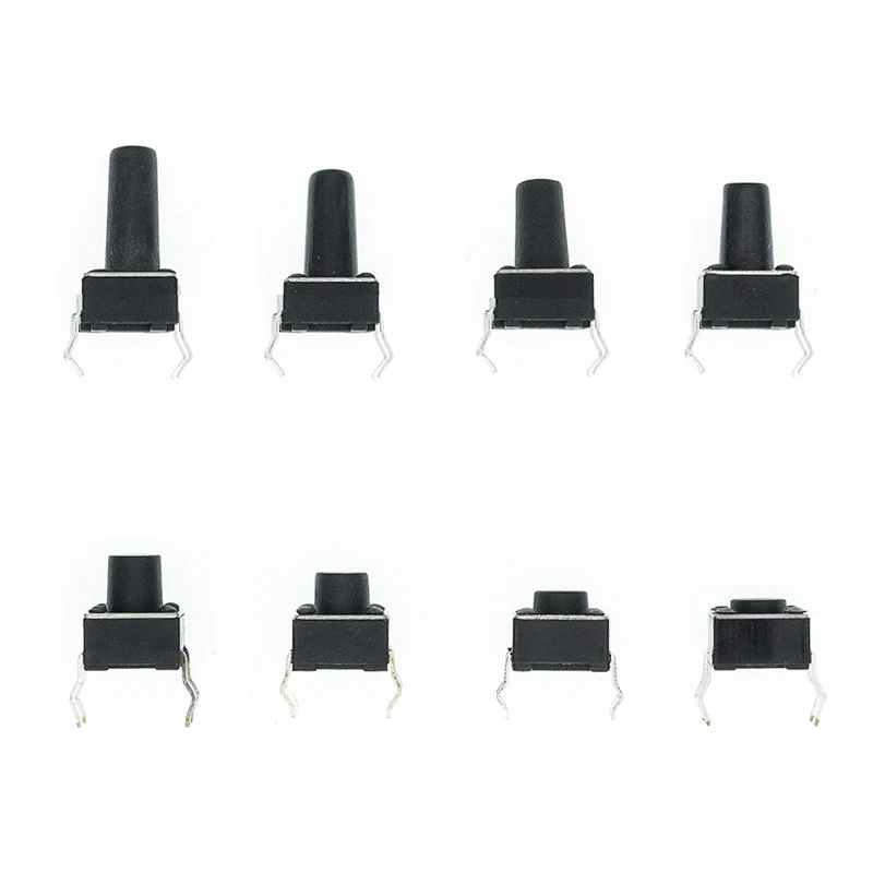 - All switches feature a tiny 6mm by 6mm square footprint with a sleek, minimalist appearance suited for modern circuitry and aesthetic projects.