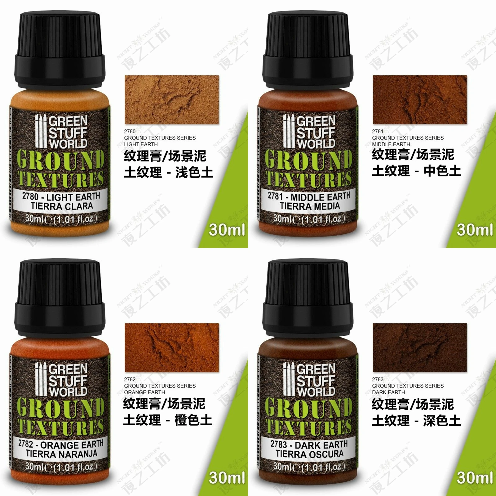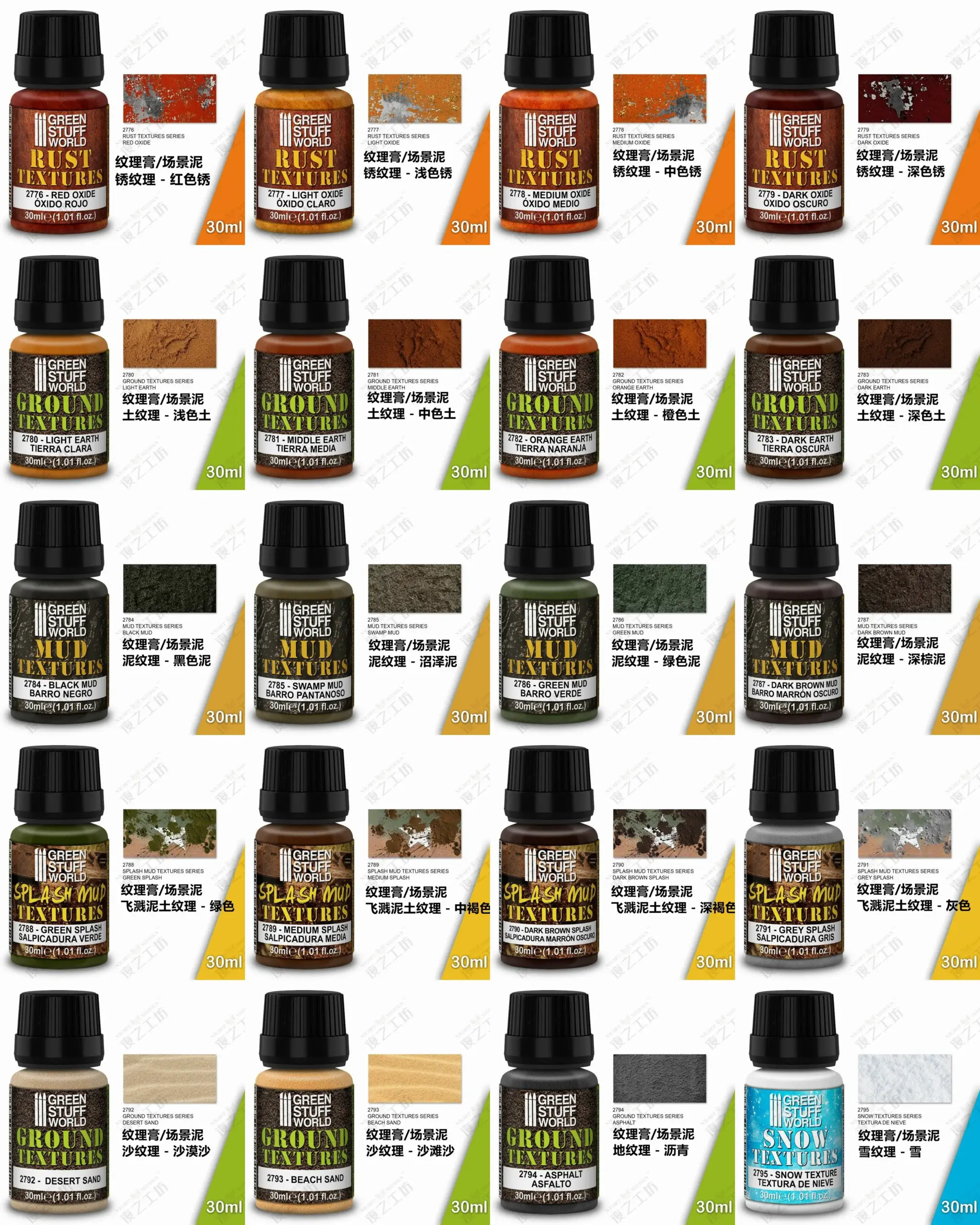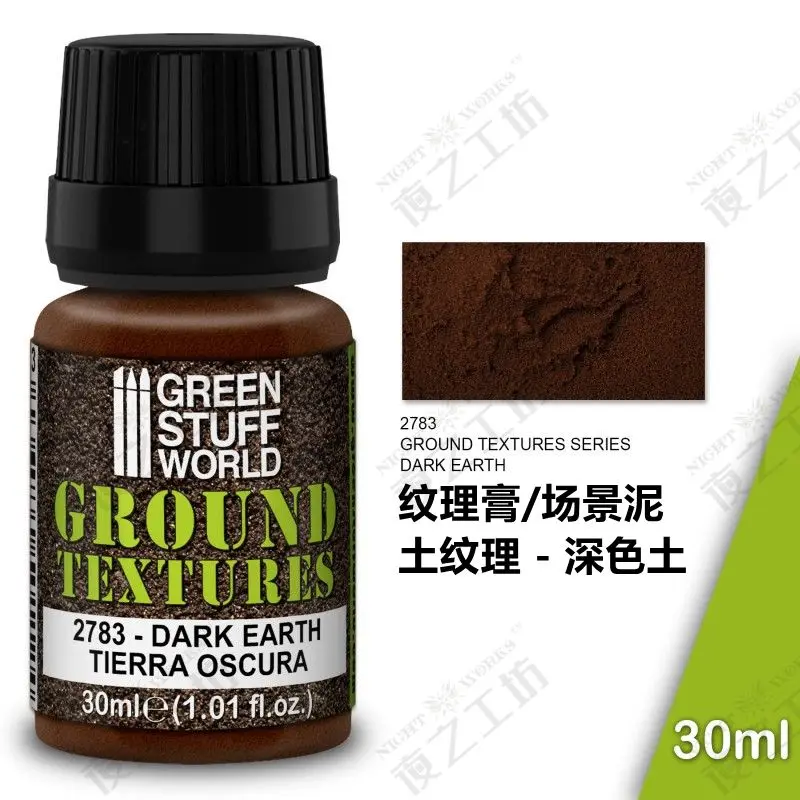 - Technical specifications include: 30ml volume, versatile texture suitable for terrain simulation, compatible with modeling paints, weathering techniques, and scene miniatures.
