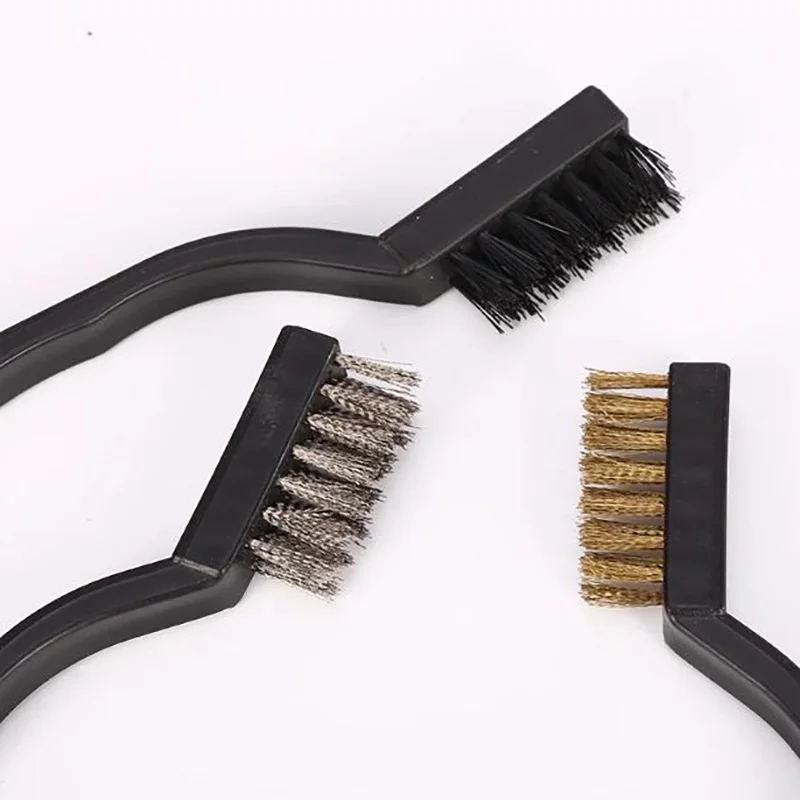 Imagine having the perfect tools to tackle any cleaning or surface preparation task with confidence. This set of three high-quality wire brushes, available in 7-inch and 9-inch sizes, provides durability and efficiency for a wide range of applications. Crafted from sturdy plastic handles with ergonomic designs and small hanging holes, they ensure comfort during extended use. The brushes feature different bristle materials—black nylon, golden brass, and stainless steel—each tailored to specific tasks. Whether you're removing rust, paint, or debris, polishing metal, or cleaning delicate surfaces, these brushes are your reliable companions. Elevate your workspace today with tools that combine style, function, and longevity.