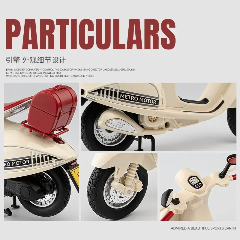The 1:12 Vespa 946 Alloy Classic Leisure Motorcycle Model is a stunning representation of vintage design, making it a perfect addition to your collection. Featuring a beautiful cream or beige body with a vibrant red seat and matching rear storage box, this diecast model is built with intricate detailing from durable metal. The chrome headlight and realistic handlebars enhance authenticity, while the sleek black base elevates its presentation. Imagine showcasing this masterpiece in your space, where its retro charm and functional sound and light effects will certainly capture attention. This model artfully blends nostalgia with superior craftsmanship, making it an ideal gift for enthusiasts and collectors alike.