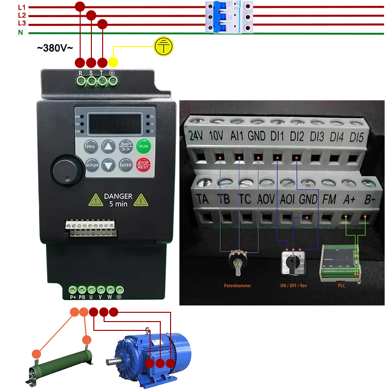 - Includes advanced functions such as forward/reverse motion, speed regulation via panel or external control, built-in brake unit, PID control, and multi-stage operation.