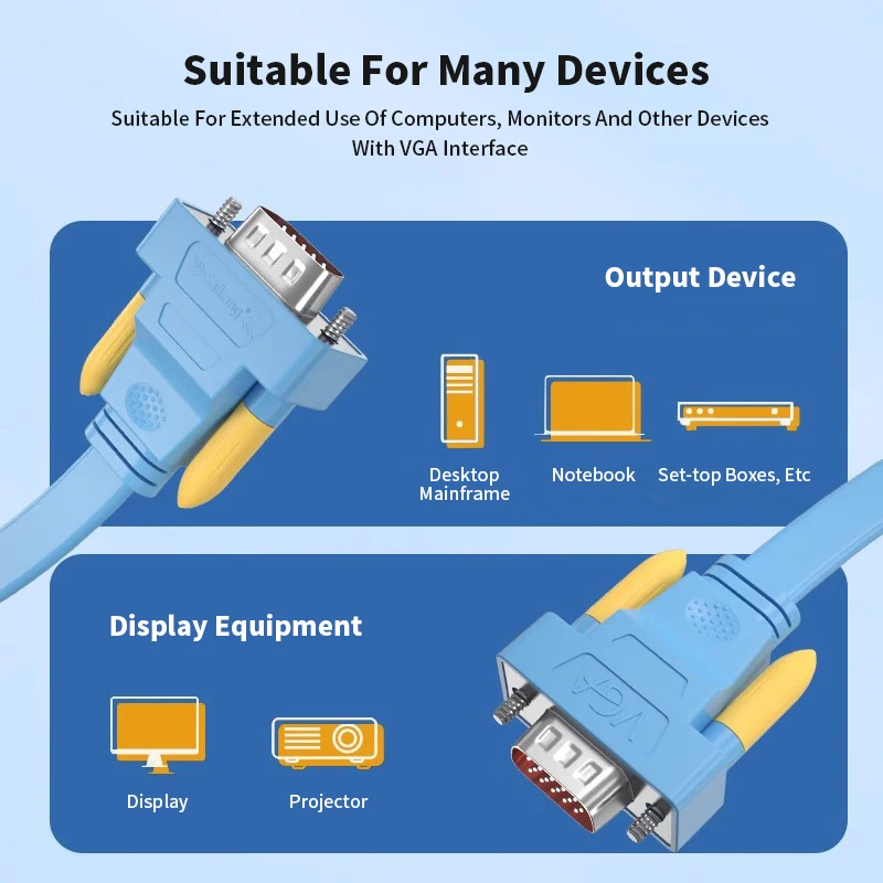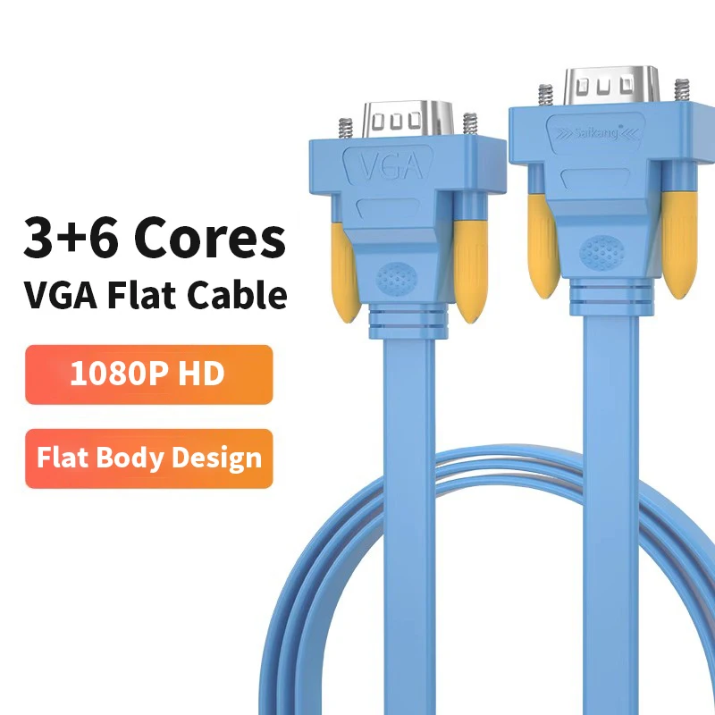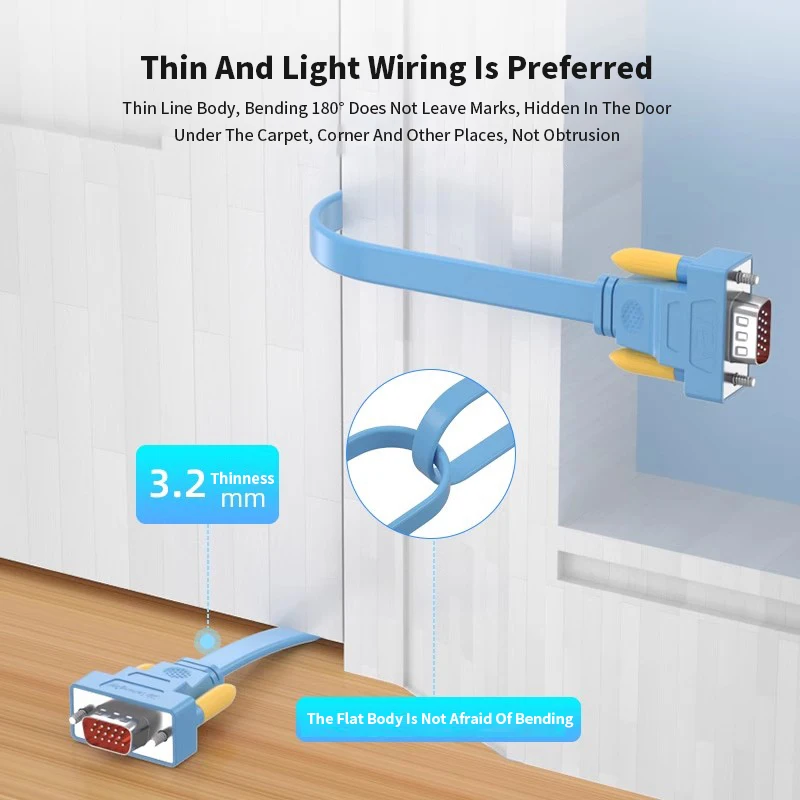 Experience high-quality video data transmission with this flexible VGA cable, featuring a durable PVC line body and nickel-plated connectors for reliable connectivity. Measuring approximately 3.4cm by 3.7cm with a thickness of 3.2mm, it supports 1080P resolution ideal for connecting computer monitors, TV projectors, and other electronic devices. Available in blue, black round line, and black, it comes in lengths from 0.5m to 10m, allowing for versatile installation options. Designed with male-to-male connectors and featuring gold-plated pins and a yellow clip on the male end, this cable ensures a secure, high-quality connection for seamless video and data transfer.