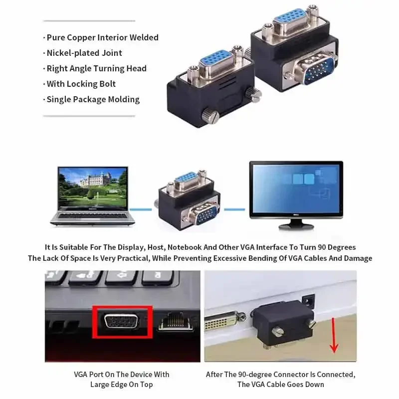- Features a 90 and 270-degree elbow design, perfect for tight or awkward installation spaces, facilitating flexible positioning of VGA-compatible monitors and projectors effortlessly.