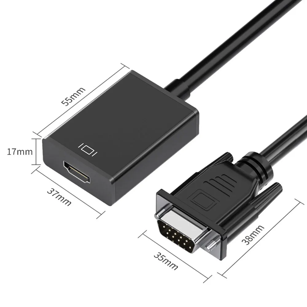Imagine effortlessly connecting your PC or laptop to an HDTV or projector with this stylish VGA to HDMI converter. With its streamlined black matte finish and high-grade aluminum alloy shell, it offers a perfect blend of modern design and durability. Compact and lightweight, this device makes portability a breeze, fitting seamlessly into your workspace or entertainment area. Whether you're giving a presentation or enjoying multimedia content, the converter ensures high-quality Full HD 1080p resolution at 60Hz, delivering clear visuals with vibrant colors and rich audio. Its plug-and-play functionality means you can set it up in moments—no drivers required. Reliable, efficient, and designed for professional use, it transforms your display experience with confidence.