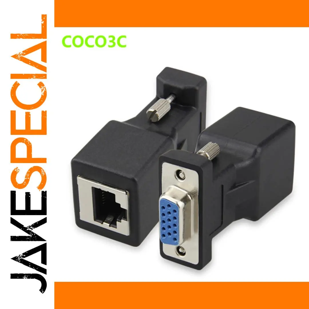 This VGA to RJ45 adapter features a black, compact rectangular design with a textured plastic exterior, metallic frames around the 15-pin female VGA port, and vibrant blue inserts for easy identification. Equipped with ridged silver thumb screws for secure connection, it allows signal transmission over CAT5, CAT5E, or CAT6 cables up to 100 feet without external power. Ideal for extending VGA signals via network cables, it is compatible with LAN cables and designed for straightforward, reliable use. Package includes one adapter, with a need to purchase two for complete connection, making it an efficient solution for professional video and data extension.