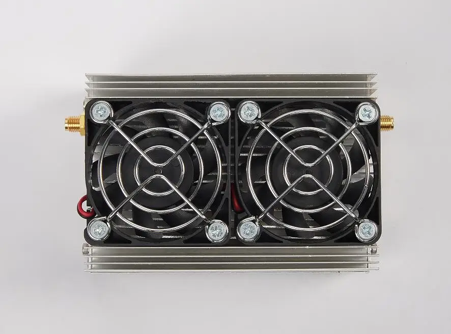 Experience reliable signal amplification with this durable RF power amplifier, designed for VHF frequencies from 136MHz to 174MHz. Crafted with a sleek stainless steel shell, it offers a professional industrial appearance with matte finish and prominent heat dissipation fins. The device features two high-quality stainless steel wire cooling fans that ensure optimal temperature management, surrounded by black protective covers. Its compact size of 100mm x 70mm x 60mm and lightweight of only 400g make it easily portable for outdoor or vehicular use. The front panel showcases gold-colored SMA-K ports for antennas and vibrant orange DC power input, providing a striking contrast well-suited to a technical environment. Perfect for enhancing your communication range, this amplifier combines rugged durability with sleek design elements.