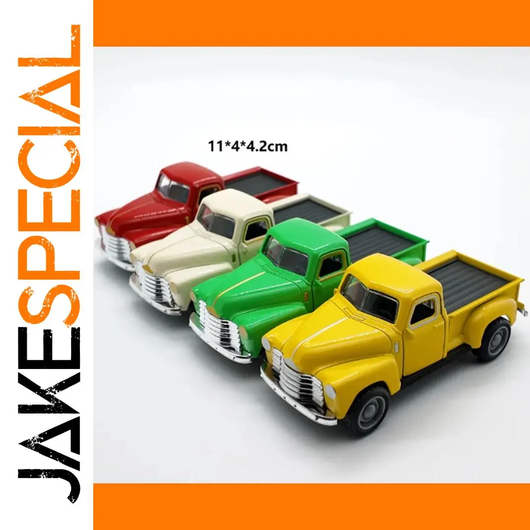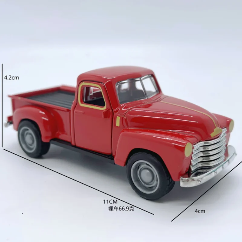 Imagine showcasing these stunning miniature pickup trucks as part of your collection or display. Crafted from alloy and plastic, each model boasts a glossy, smooth finish in vibrant hues—bright red, beige, green, and yellow—that instantly catch the eye. With a vintage, classic design, these models feature streamlined bodies, prominent front grilles, rounded cabs, and contrasting black beds, embodying nostalgic charm. Their compact size of approximately 11 cm in length and 4 cm in width makes them perfect for desktop or shelf displays. Whether you're an enthusiast or looking for an eye-catching gift, these collectible ornaments are a perfect addition to any decor. They.