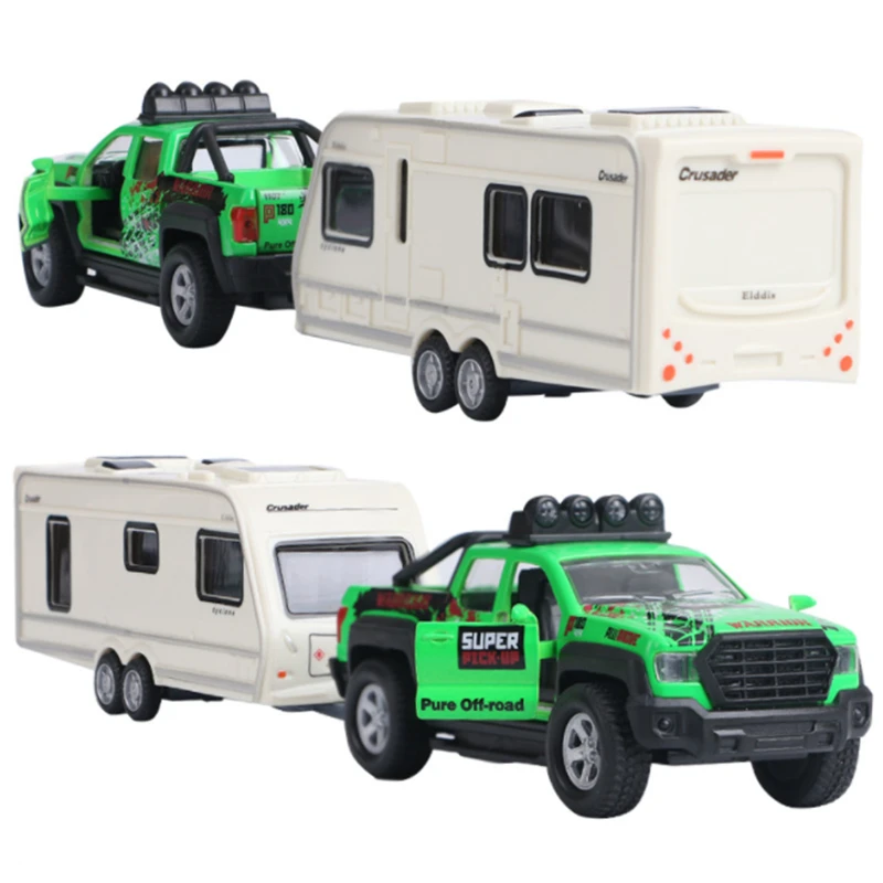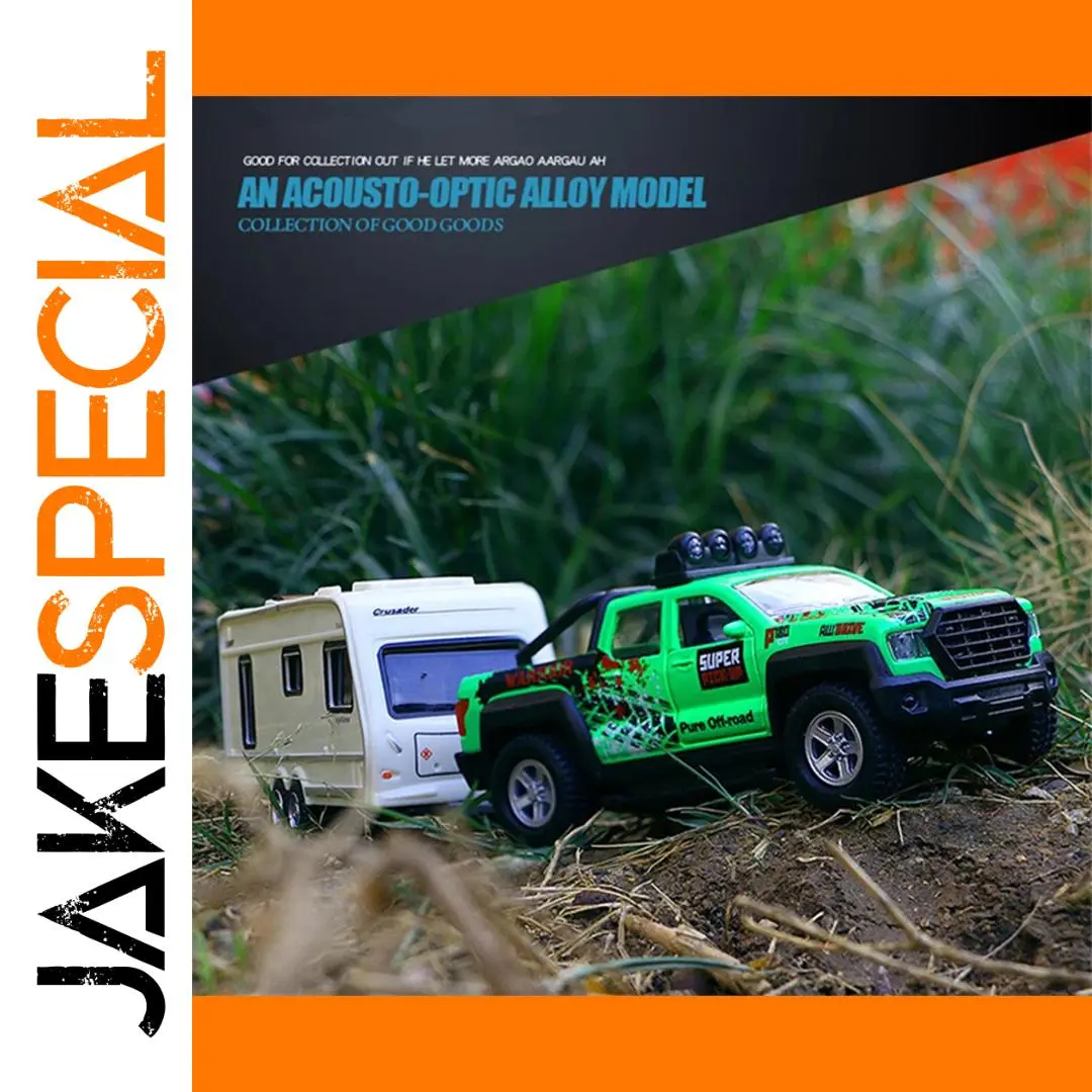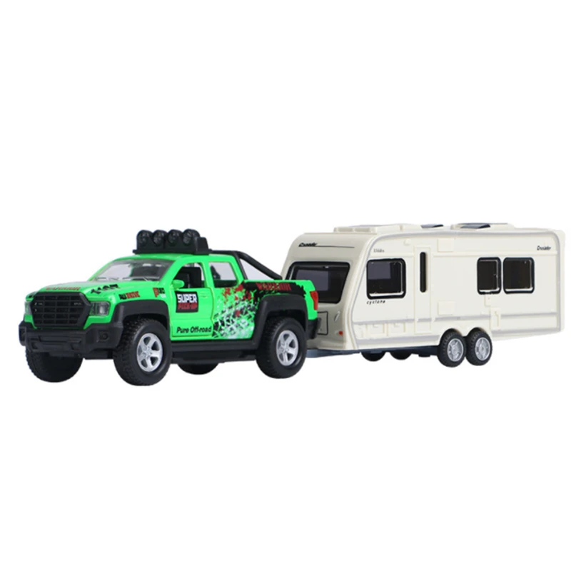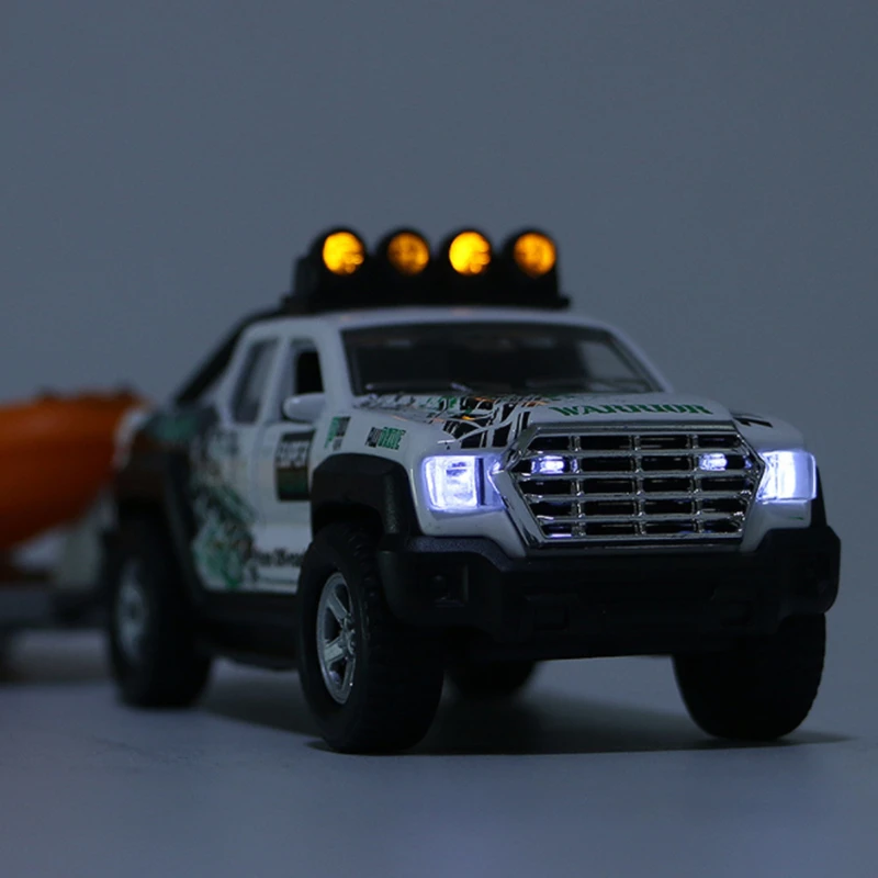 This 1/32 scale diecast model showcases a vibrant green pickup truck with black accents, including a grille, bumper, side mirrors, and roof-mounted auxiliary lights, complemented by colorful decal designs featuring graphics and text. The model features realistic silver alloy wheels with textured black tires, mounted on a sturdy metal alloy body, and connected to a sleek white yacht trailer with black detailing, windows, and door features. Perfect for display or imaginative play, this detailed transport vehicle emphasizes a rugged, adventurous aesthetic with its bright colors and lifelike design elements. Suitable for collectors aged 4 and up, it offers an authentic, high-quality recreation of a travel and yacht transport scene.