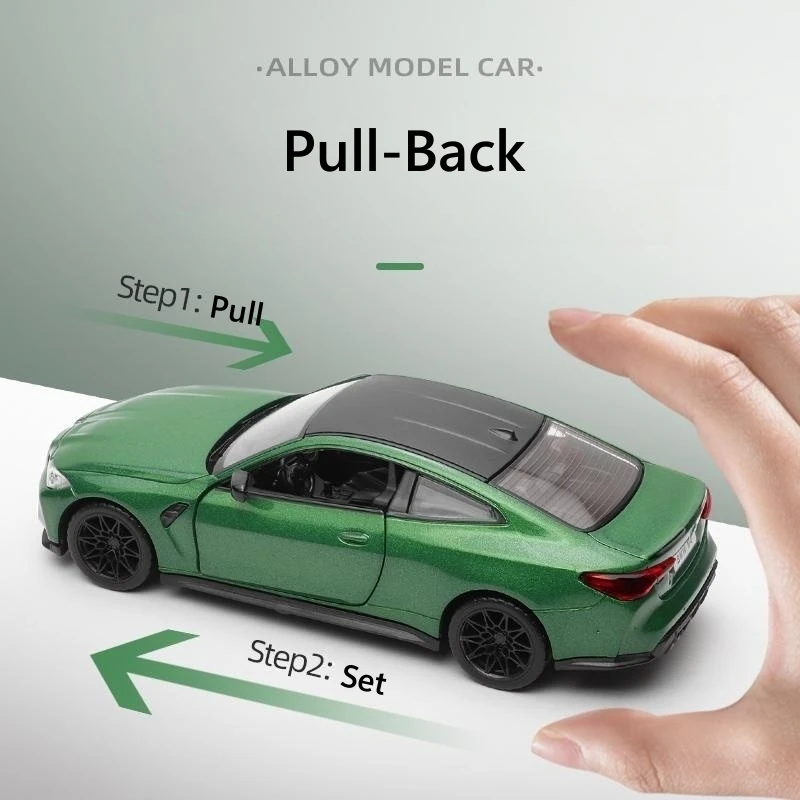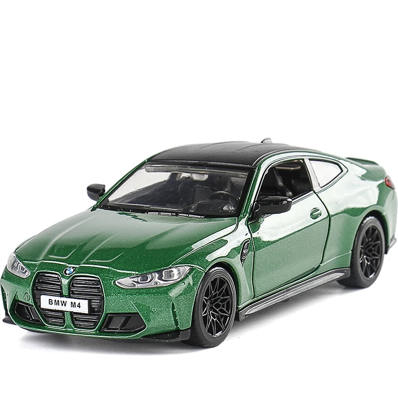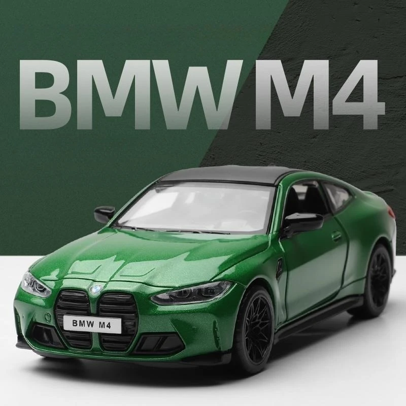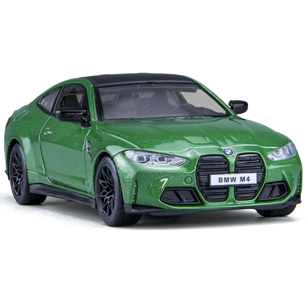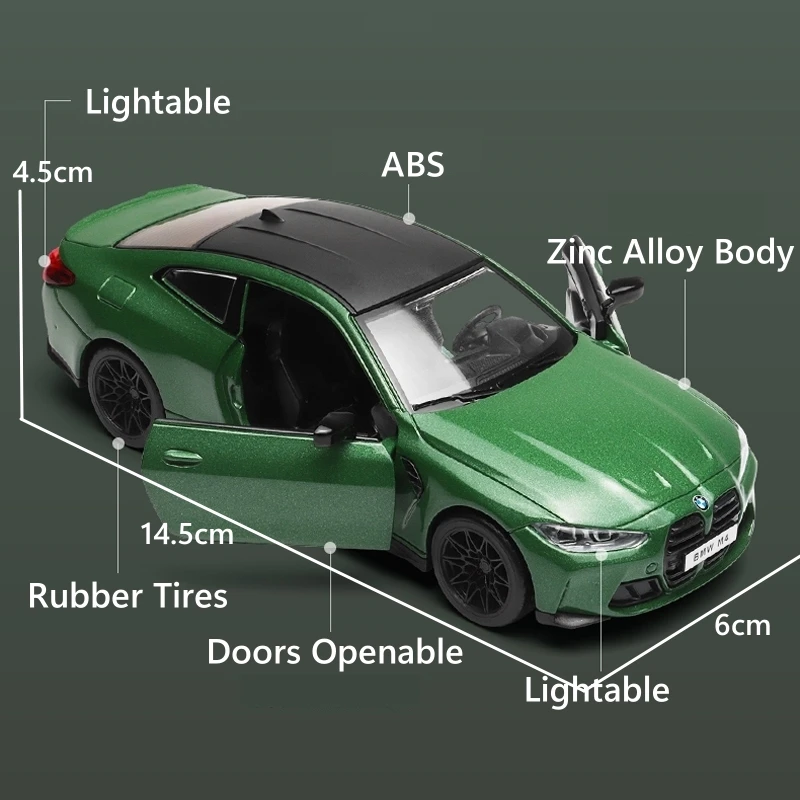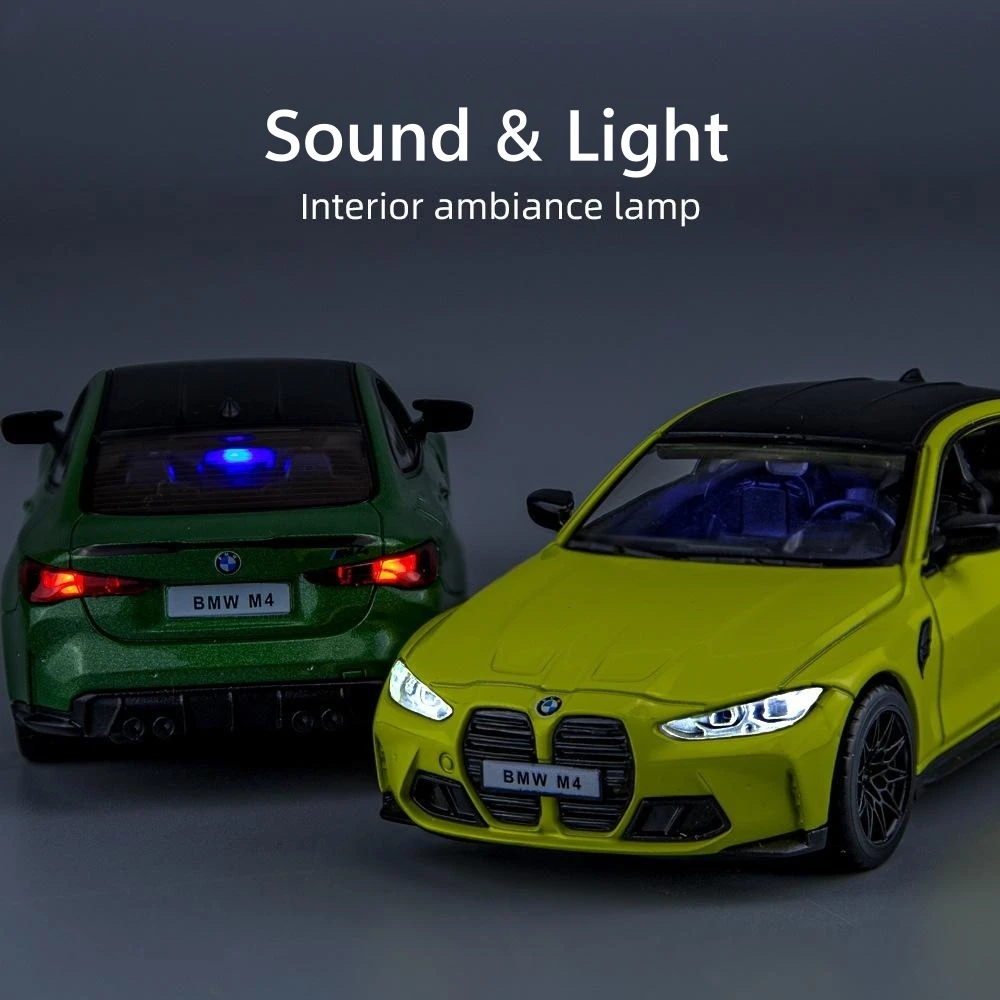 Experience the thrill of owning this highly detailed 1/32 scale diecast model of the BMW M4 G82, measuring approximately 3.5″ in length. Crafted from durable metal alloy, it features a vibrant yellow-green exterior accented with black on the grille, side mirrors, and multi-spoke wheels. The coupe silhouette is enhanced by a sloping roofline, subtle door handles, aerodynamic vents, and LED-style headlights. The functional doors open smoothly to reveal an intricately detailed interior with dashboard and controls. This model also features light and sound functions operated by a control mechanism, making it perfect for display and collectors seeking a sporty, realistic miniature of an iconic vehicle.