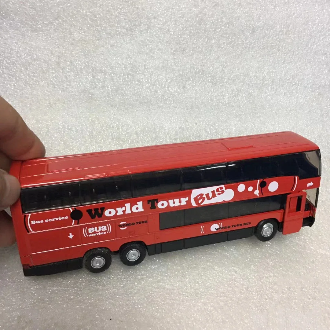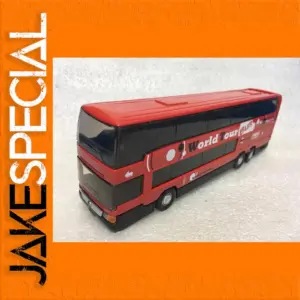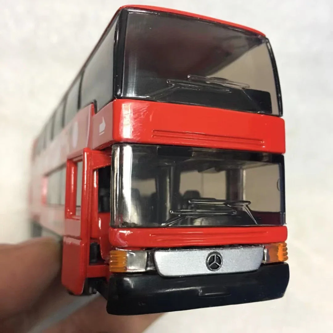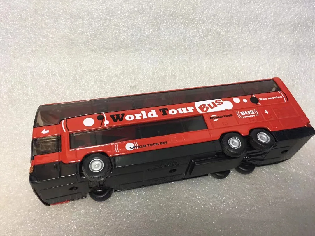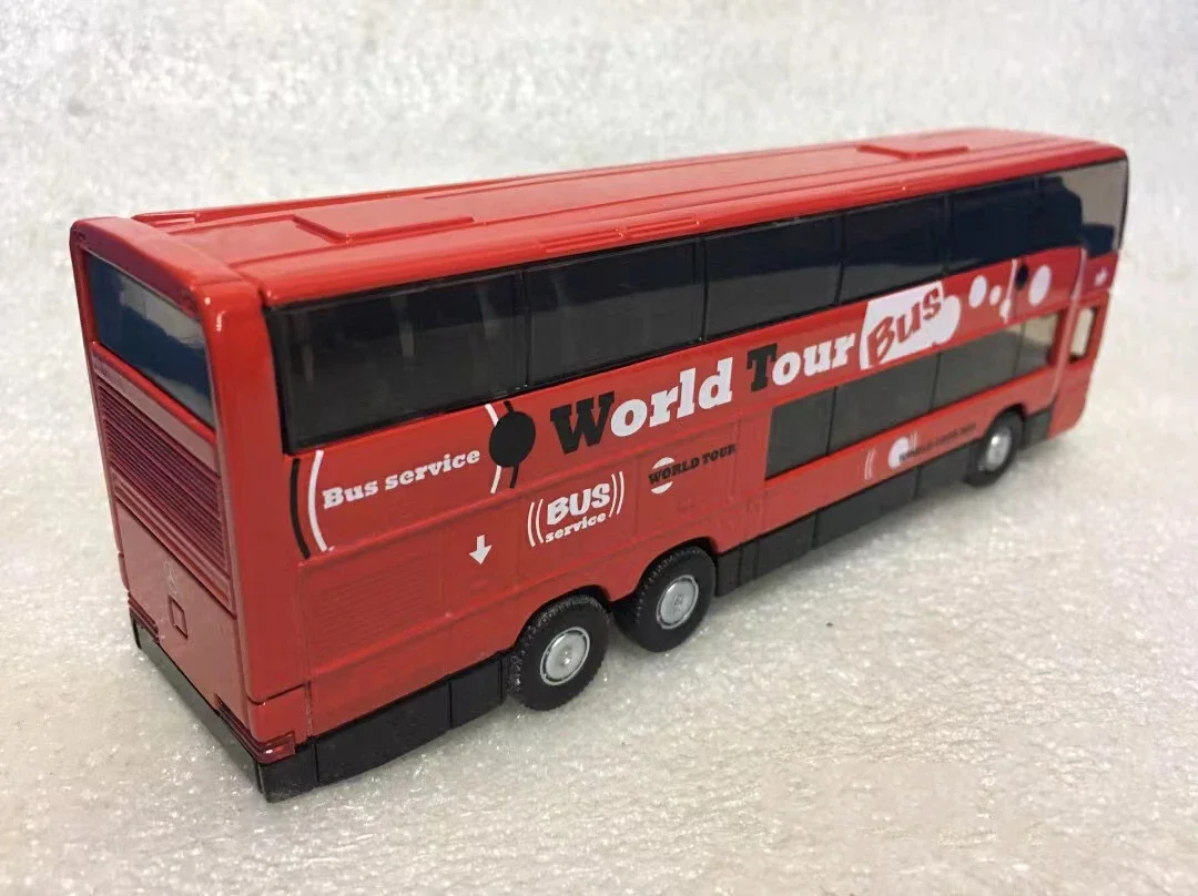 Bring a vibrant touch to your collection with this 1/60 scale diecast alloy model of a Mercedes-Benz MB 0404 double-decker bus, measuring approximately 18.5 x 6.5 x 3.8 cm. Featuring a striking world travel pattern painting in bright red with a sleek black upper deck, detailed graphics including a globe and travel symbols, and realistic molded headlights and turn signals, it captures a lively, travel-inspired aesthetic. Made from durable metal and ABS plastic, this model includes a pull-back function for movement and is perfect for display, souvenirs, or gifts. Minor paint flaws like rashes or drops do not affect its collectible value.