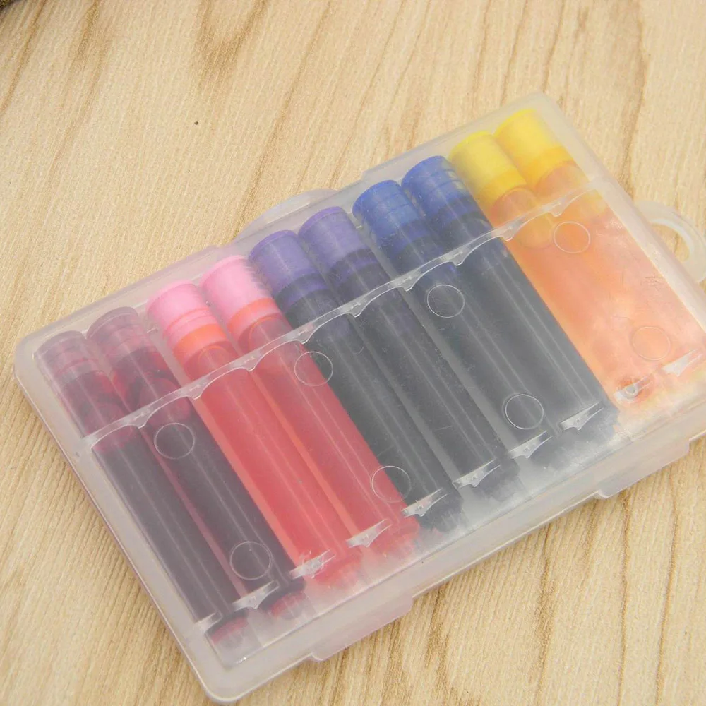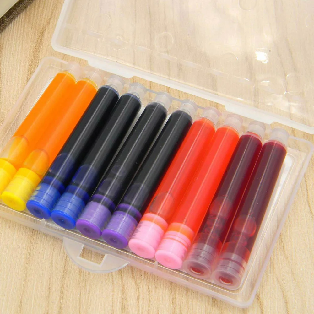 Imagine your favorite fountain pens ready for your next writing session. This set of ten high-quality ink refills transforms your writing experience with vivid, resistant colors that last. Encased in a sleek, transparent box, each refill showcases a bright, rounded cap in colors such as yellow, blue, purple, pink, and maroon—making it easy to select the shade you desire. Designed for compatibility with popular models like Hero 359, Jinhao 599, and PK, these refills provide smooth, consistent ink flow for every stroke. Whether you're writing letters, journaling, or sketching, this pack ensures your creativity flows without interruption. Elevate your writing with this reliable, stylish refill set.