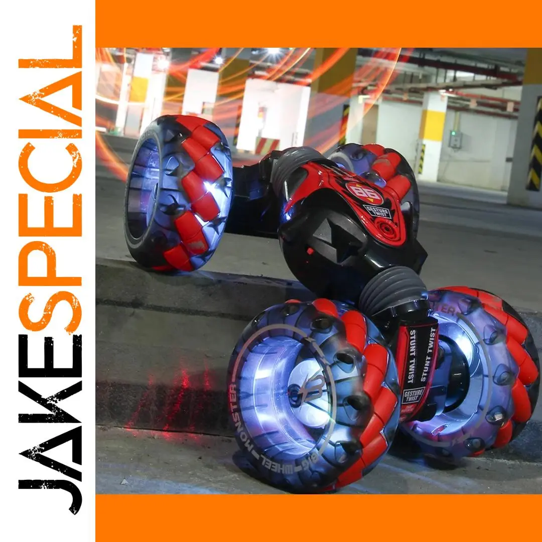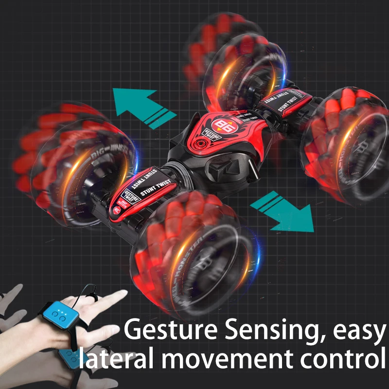 Experience adrenaline and excitement with this 1:16 scale RC car, featuring a vibrant red, black, and blue sporty design. Its sleek aerodynamic body, rugged off-road tires with prominent treads, and blue translucent hubs highlight its high-performance aesthetic. Equipped with powerful LED lights that glow blue from the wheels, and capable of stunt maneuvers, this car is perfect for dynamic off-road action. Operating on a 2.4GHz remote with 6 channels and a remote distance of up to 100 meters, it offers 45 minutes of playtime from a 1200mAh lithium battery, with a 3-4 hour charge. Made from durable ABS plastic and metal, it’s a ready-to-run toy with lighting, music, gesture sensing, and switchable controller modes for maximum fun and versatility.