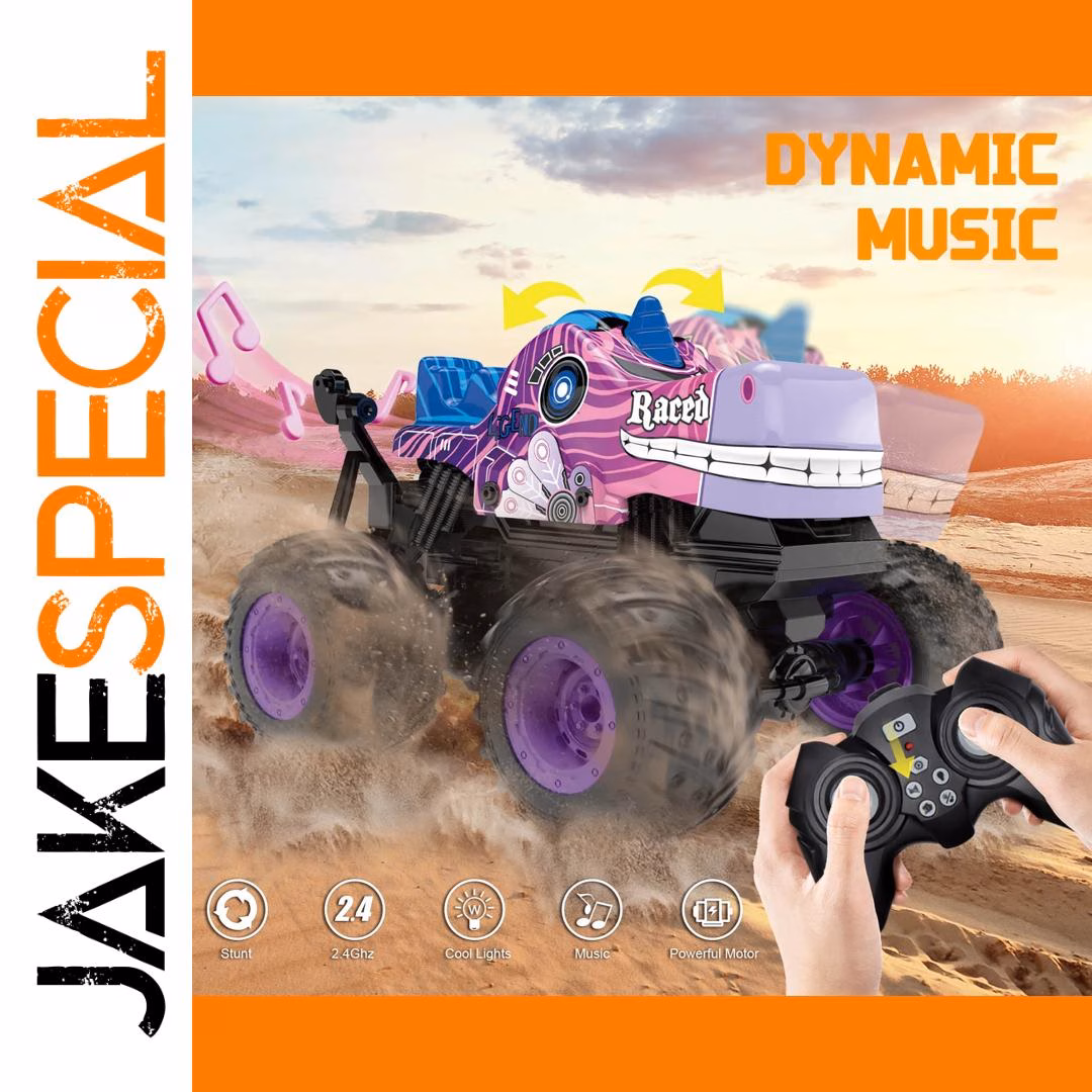 Experience the thrill of this colorful, cartoon-inspired remote control stunt car, designed to spark excitement. Its dynamic shark head front and bold purple body, accented with bright blue, pink, and black details, create an engaging visual appeal. Large rugged tires with purple centers and a compact 17 x 16.6 x 12.3 cm size make it perfect for off-road adventures. This lively toy features 360-degree rotations, synchronized lights, and music for immersive fun. With a high-powered 3.7V battery offering up to 25 minutes of play, you will enjoy endless entertainment. Its ergonomic Mode 2 remote, multiple control channels, and easy operation make it ideal for enthusiasts aged 14 and up. Bring energy and personality to your collection with this exceptional stunt car.