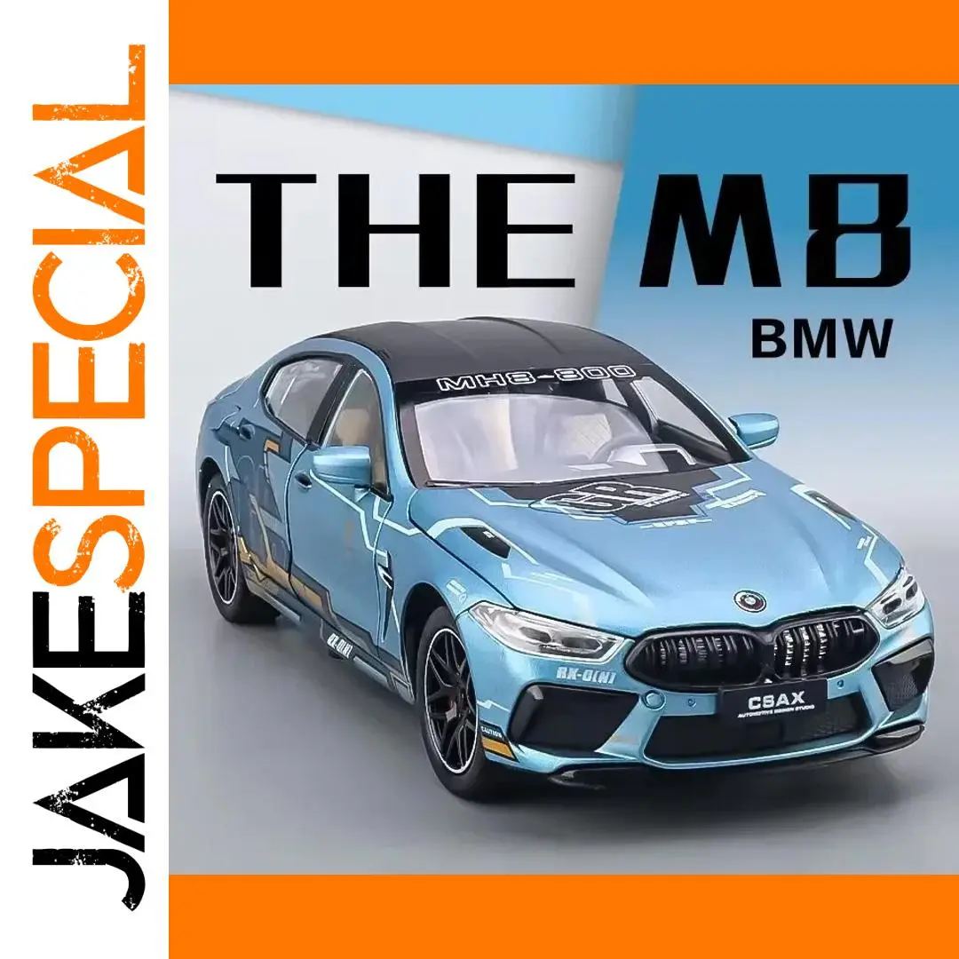 Experience the thrill of the BMW M8 supercar with this detailed 1:24 scale die-cast model, available in vibrant blue, black, purple, green, or red. Crafted from sturdy metal, it features realistic design elements such as a black grille with vertical slats, sleek angular headlights, sculpted hood lines, and stylish black multi-spoke alloy rims wrapped in rubber-like tires. The model is equipped with sound and light functions, activated via pull-back operation, enhancing its sporty appeal. Perfect for collectors, this durable toy is CE certified (number EDG2308210266C00101C), suitable for ages 4-18+, and offers an immersive experience for automotive enthusiasts.