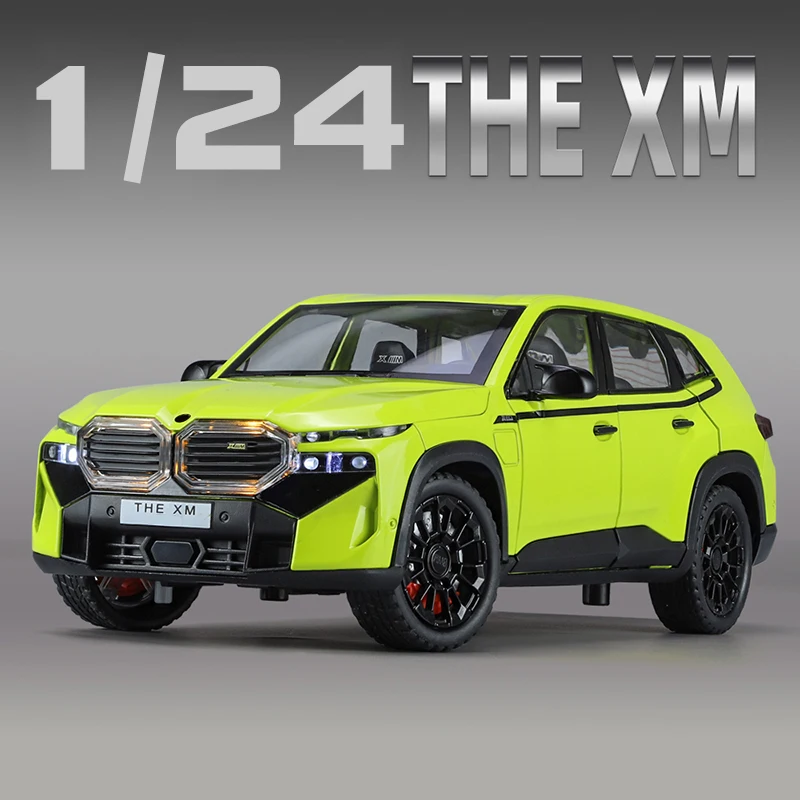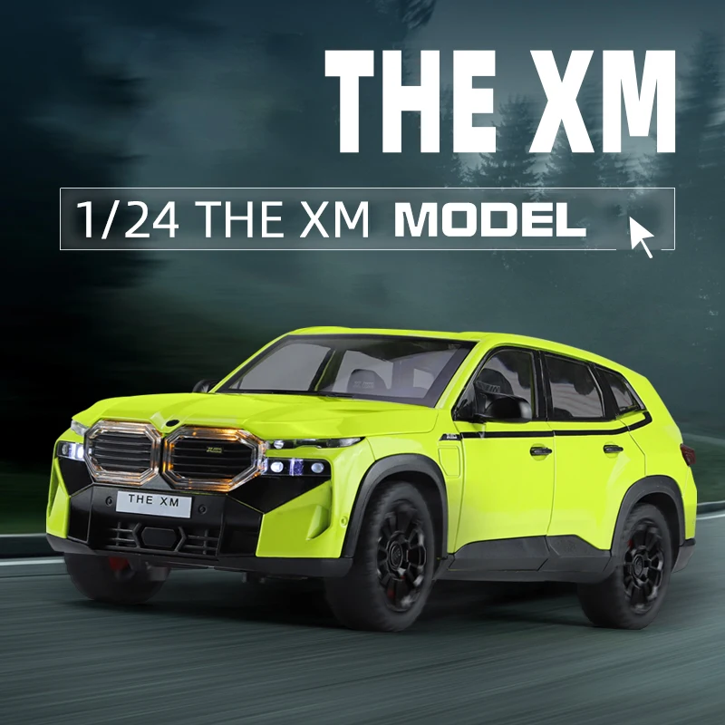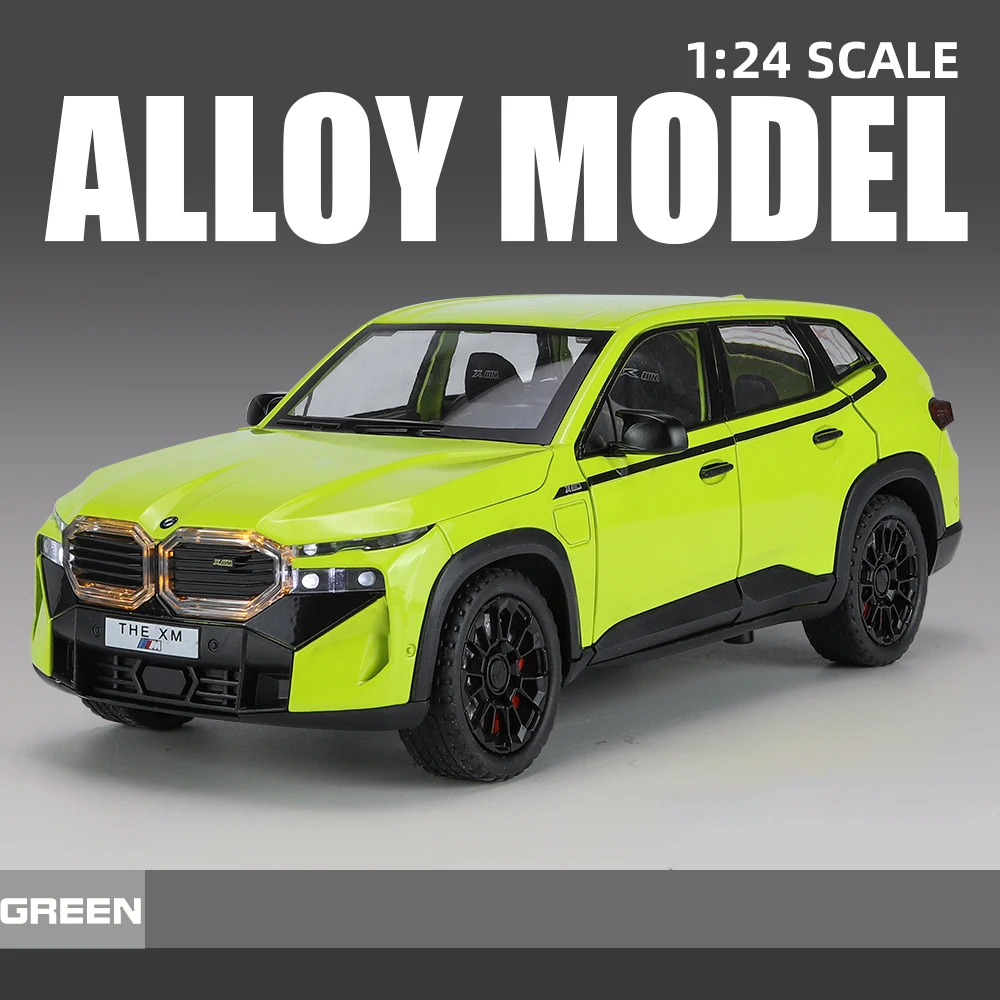 Experience the thrill of owning this highly detailed 1:24 scale diecast BMW XM SUV model, measuring approximately 10-12 cm long. Its striking lime green exterior captures attention instantly, complemented by sleek black accents and metallic details that evoke sophistication. The modern design features a sporty, aerodynamic silhouette with dynamic body lines, sharp angular headlights with illuminated effects, and a distinctive hexagonal grille highlighted by orange accents, giving it a futuristic appearance. Large tinted windows add depth, while intricately designed multi-spoke wheels and textured tires enhance realism. Made from durable metal and plastic, this collector’s piece offers both aesthetic appeal and interactive features, including sound and lighting, perfect for display or play.