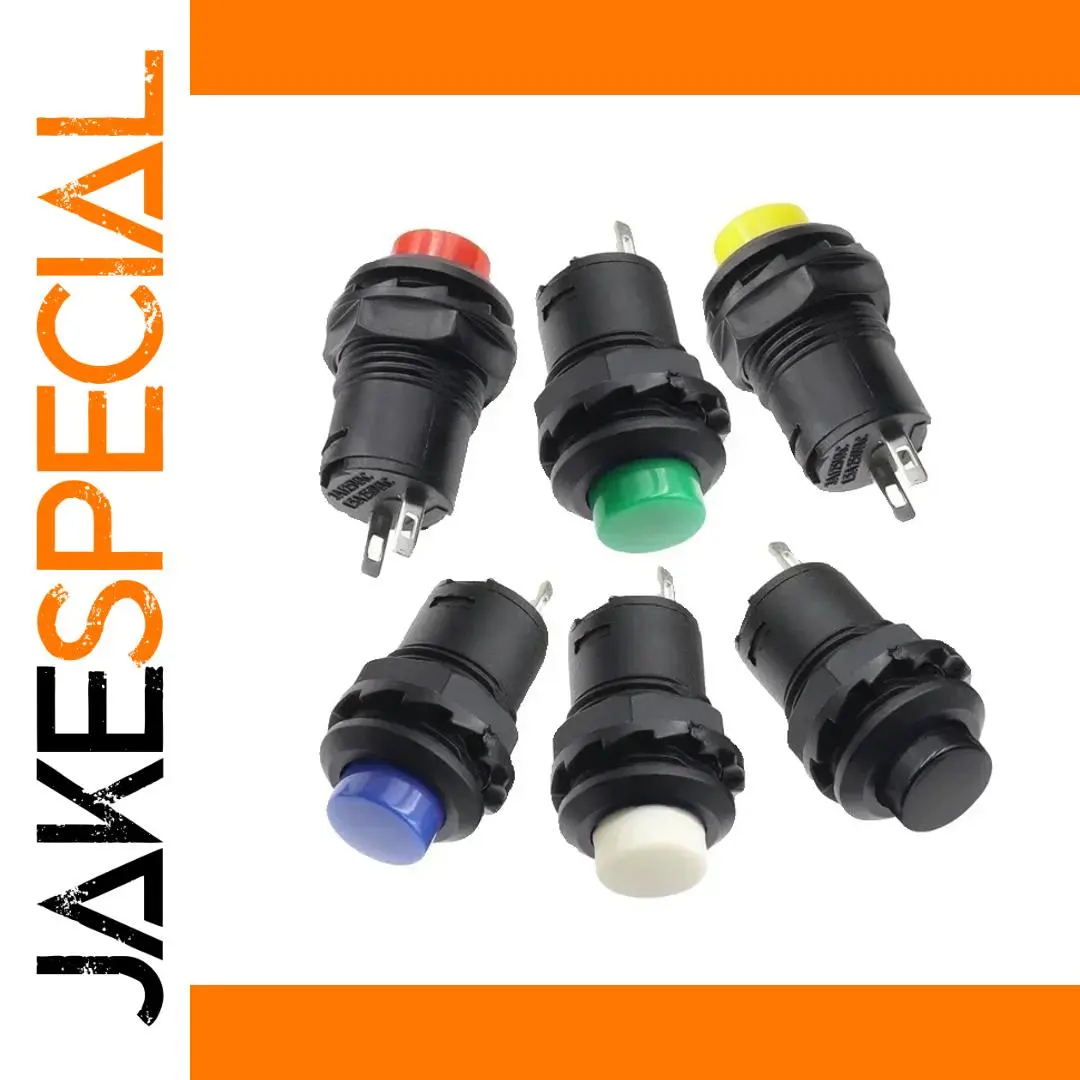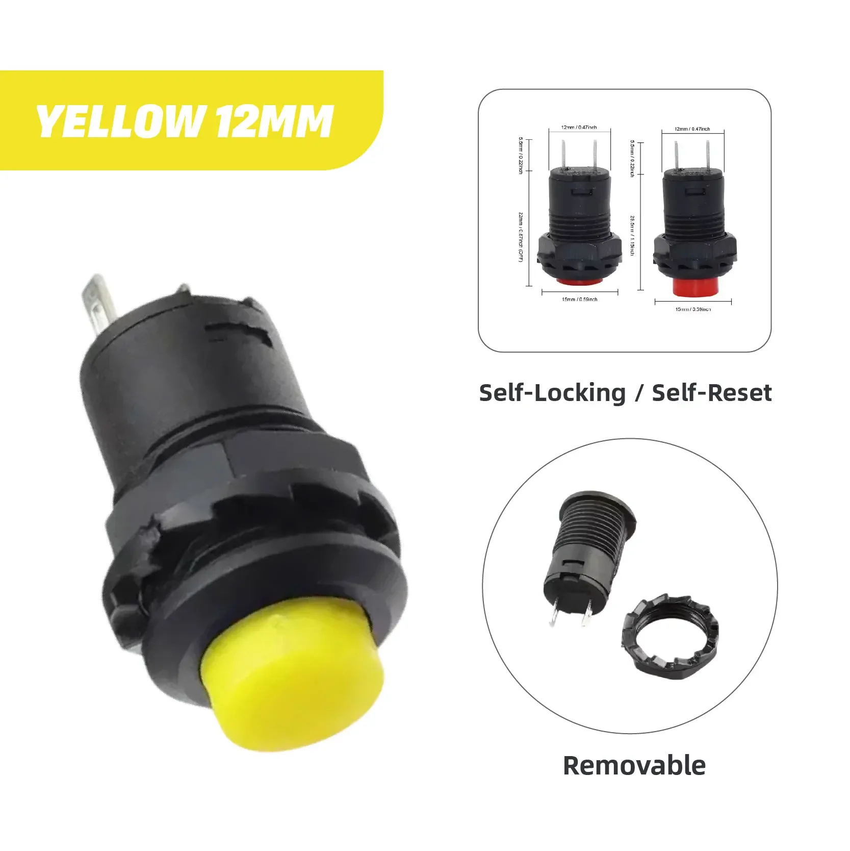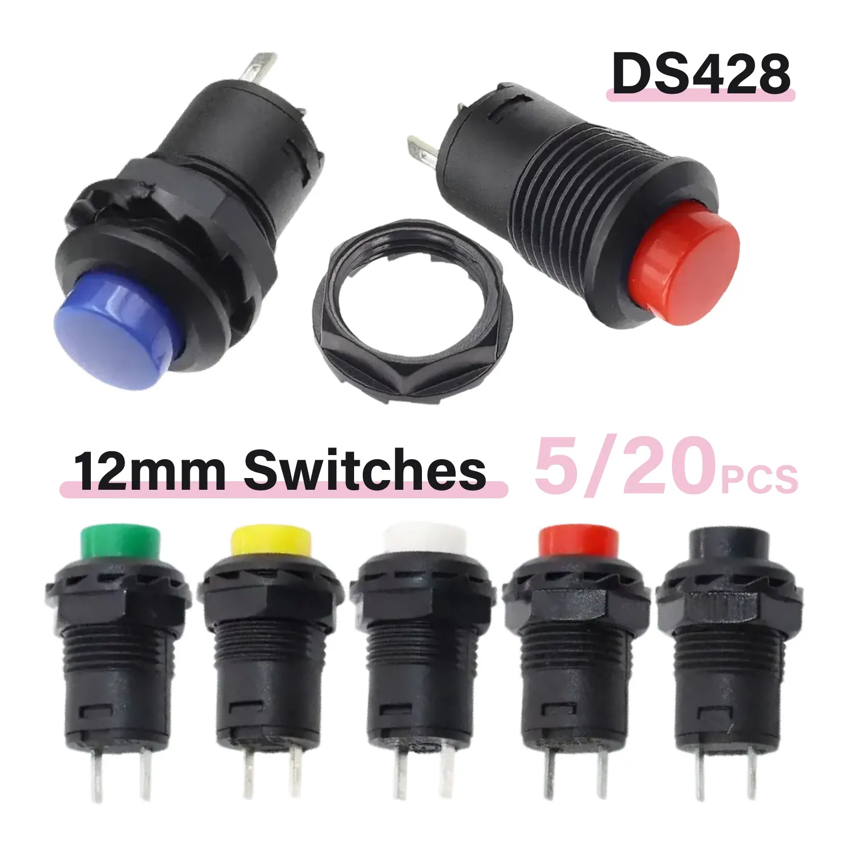 Enhance your control panel with this set of five 12mm push button switches, featuring model numbers DS428 and DS427. Available in vibrant colors—yellow, white, green, red, blue, and black—these switches combine sleek, convex plastic buttons with durable black cylindrical bodies. They support both self-reset and self-locking functions, with connector types including lockless and self-locking options. Designed for customizable voltage applications, each package provides a reliable, visually striking solution for various DIY or professional projects. Crafted without high-concern chemicals, these high-quality switches are ideal for creating intuitive, responsive control interfaces in multiple settings.