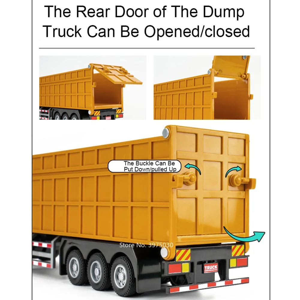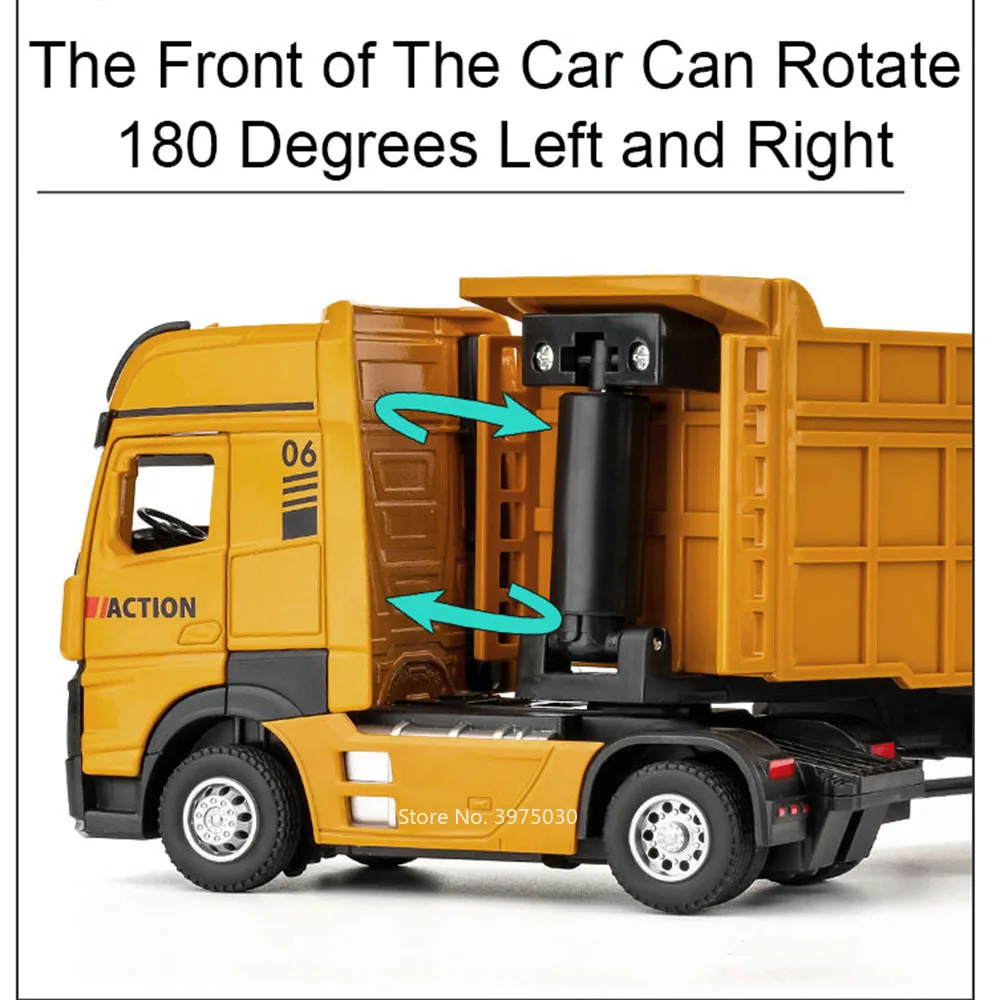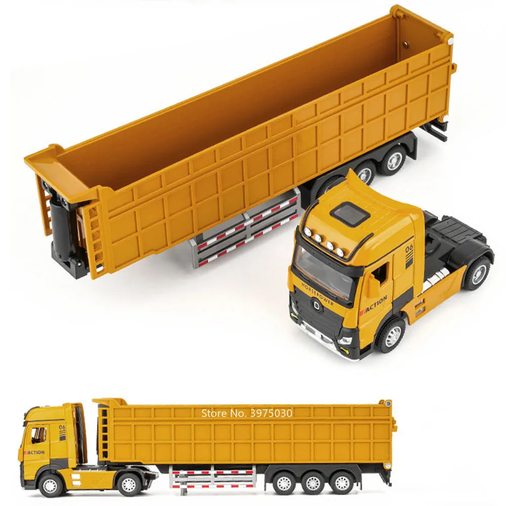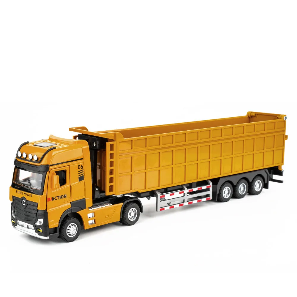This highly detailed 1:50 scale miniature trailer dump truck features a vibrant yellow zinc metal body, plastic chassis, and rubber tires, measuring approximately 33 cm long, 5 cm wide, and 8 cm high. Designed for realism, it boasts three functional doors that open, along with sound and light effects, a pull-back mechanism, and durable construction with included batteries. Perfect for collectors and enthusiasts, this model captures the rugged, industrial aesthetic of heavy-duty dump trucks, with textured surfaces, realistic tires with treads mounted on shiny silver rims, and a bright yellow trailer bed that opens at the top.