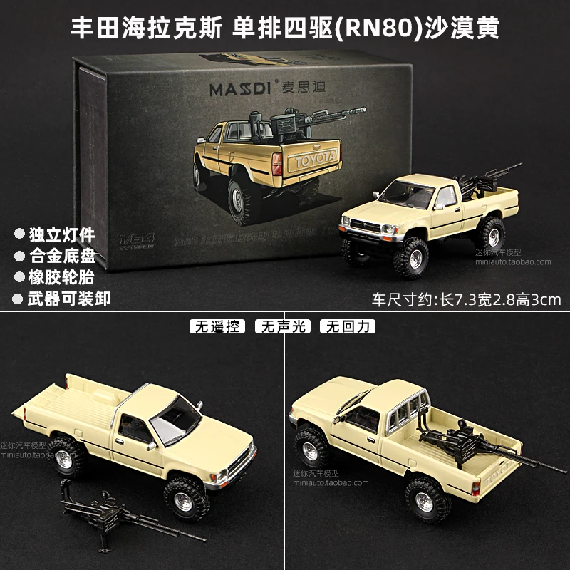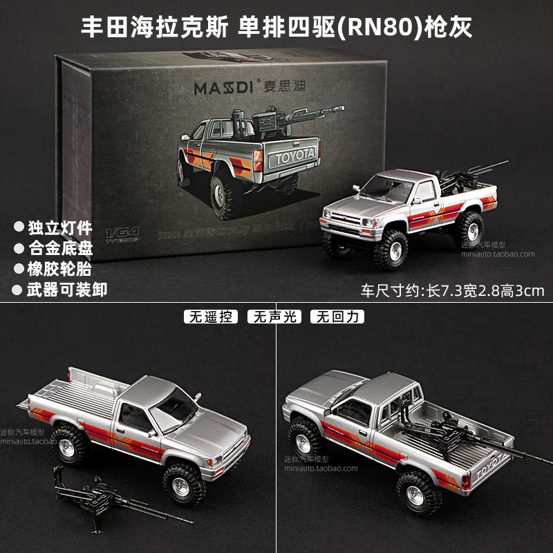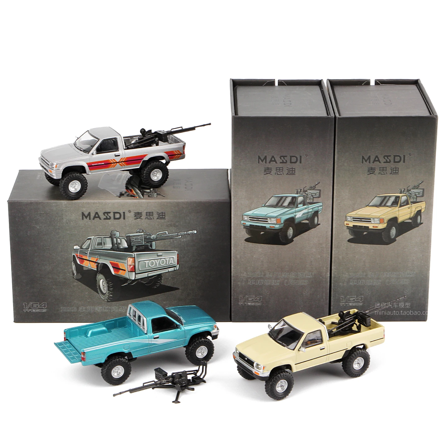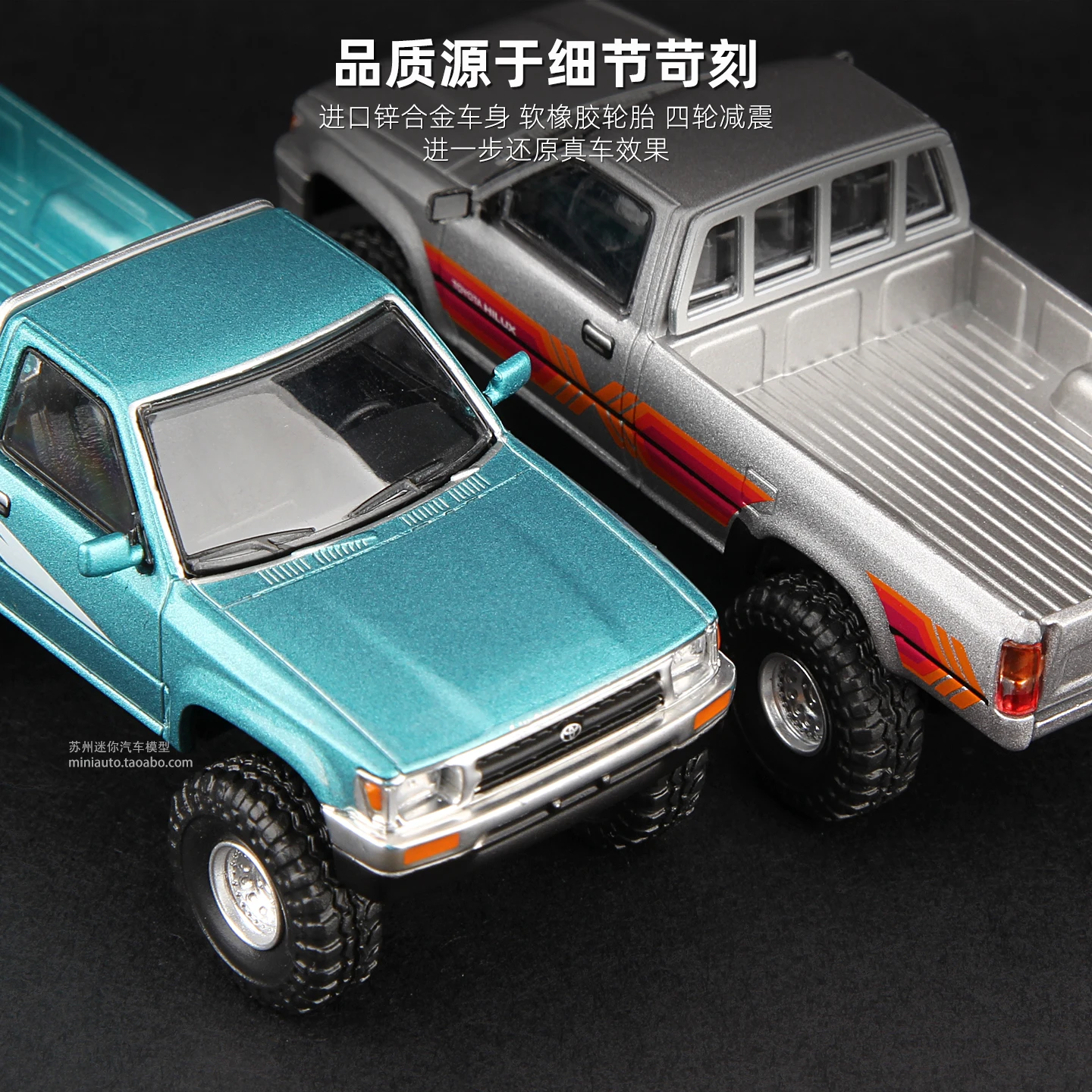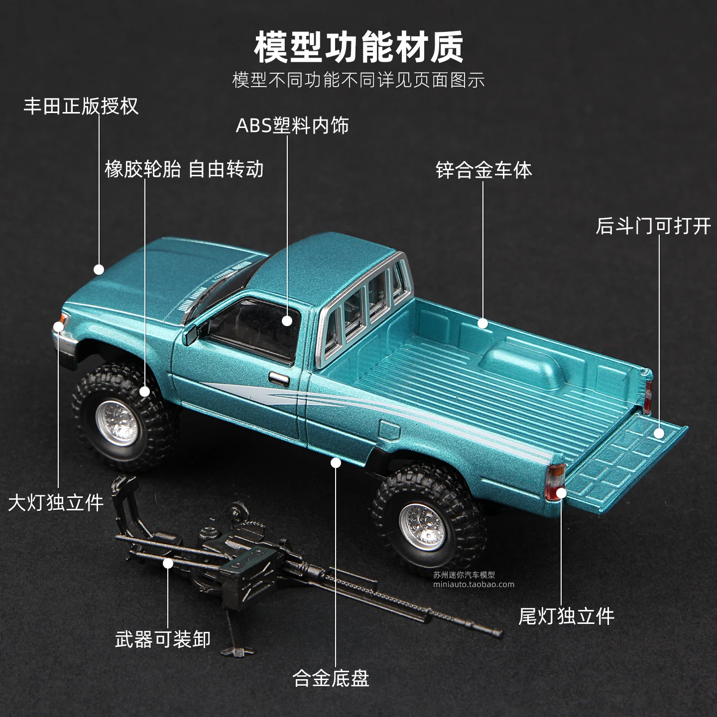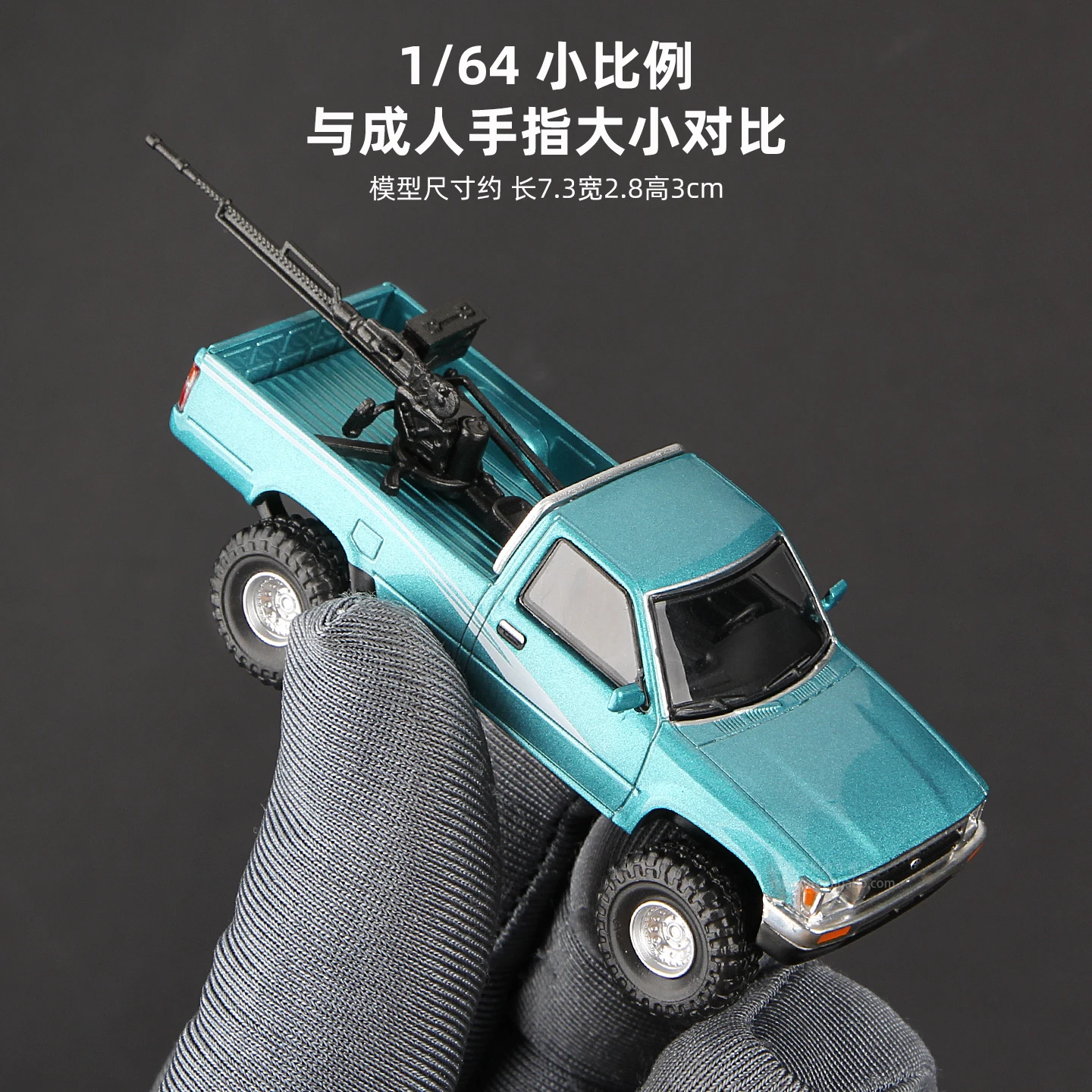 Step into the world of collectible models with this stunning 1:64 scale diecast Toyota Hilux from 1994 or 1995. Crafted with precision, this metal replica features a glossy, eye-catching teal finish that captures the rugged and adventurous spirit of the original vehicle. Its detailed design includes a realistic grille with integrated headlights and turn signals, a sturdy black bumper, and matching small side mirrors. The transparent plastic windows reveal well-defined door outlines, adding to the authenticity. The truck bed is textured with realistic panel lines and holds a black, detailed military-style turret with a long barrel, adding an exciting tactical aesthetic. Finished with black tires with detailed treads and silver rims, this model exudes rugged off-road appeal. A perfect collectible for enthusiasts to display or cherish for years.