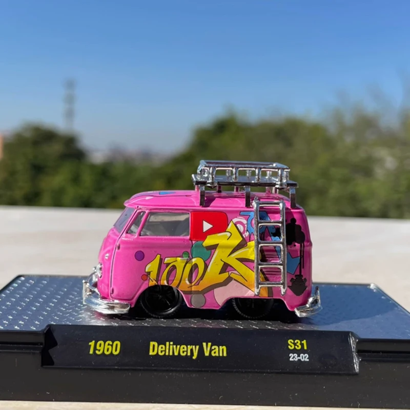 Experience the charm of the 1960s with this vibrant, bright pink miniature delivery van. Crafted with meticulous detail in alloys and plastics, this 1/64 scale model measures approximately 5.3 x 2.8 x 3.3 cm. Its rounded, compact shape features a large curved windshield, small side windows, and a shiny metal roof rack with intricate rails and supports. Bold yellow and red graphic decals, alongside playful colorful accents, render a lively retro aesthetic. The delicate detailing extends to headlights, door outlines, side mirrors, and decorative graphics, making it a striking collectible piece. Perfect for display, gifting, or enhancing your vintage collection, this model brings a cheerful nostalgic touch to any space. Its polished finish ensures a realistic and eye-catching appearance.