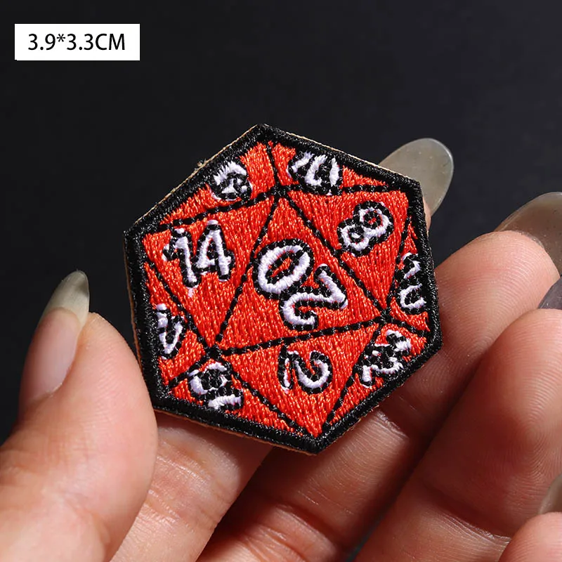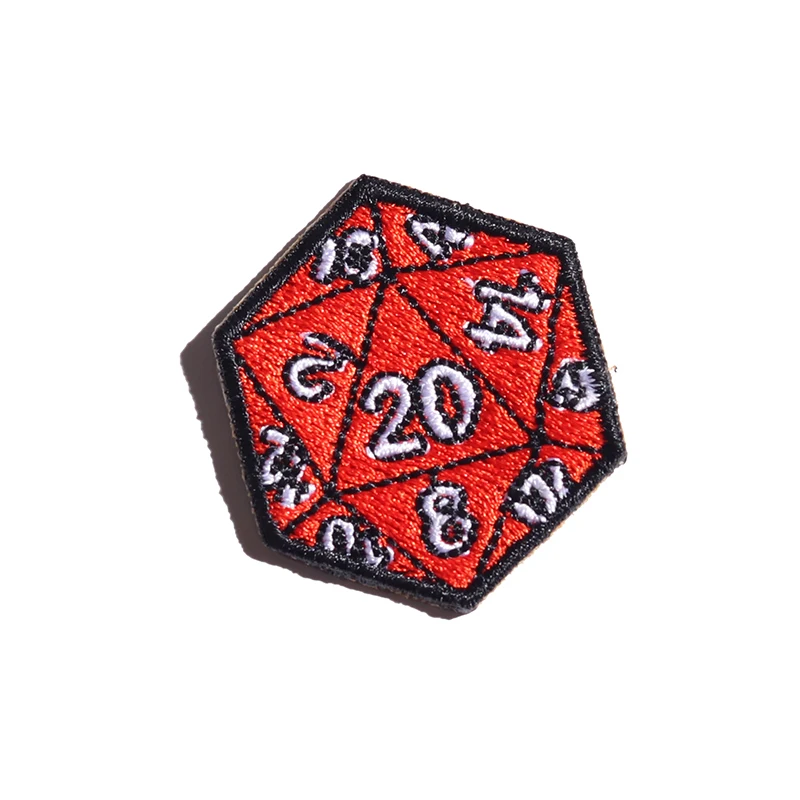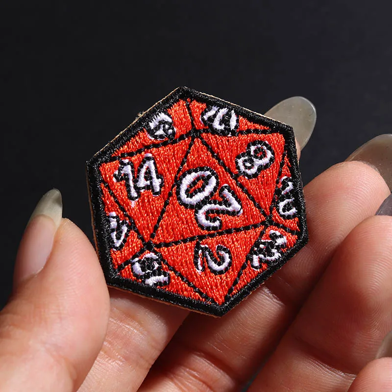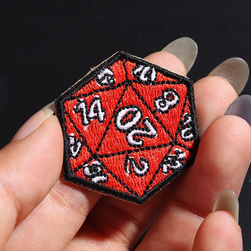 The embroidered patch features a striking hexagonal shape, primarily in a vibrant red hue, ideal for tabletop gaming enthusiasts. It gracefully showcases triangular sections, each adorned with numbers 1 to 20, executed in a bold black with a white outline, ensuring excellent visibility. Crafted from durable non-woven fabric, this patch has a smooth texture and is well-suited for iron-on application, making it perfect for personalizing clothing and backpacks. At dimensions of 3.9 cm in height and 3.3 cm in width, it's hand-sized yet impactful, allowing you to express your gaming passion effortlessly. No visible sewing is present, but it can be sewn on if desired, adding versatility to its application.
