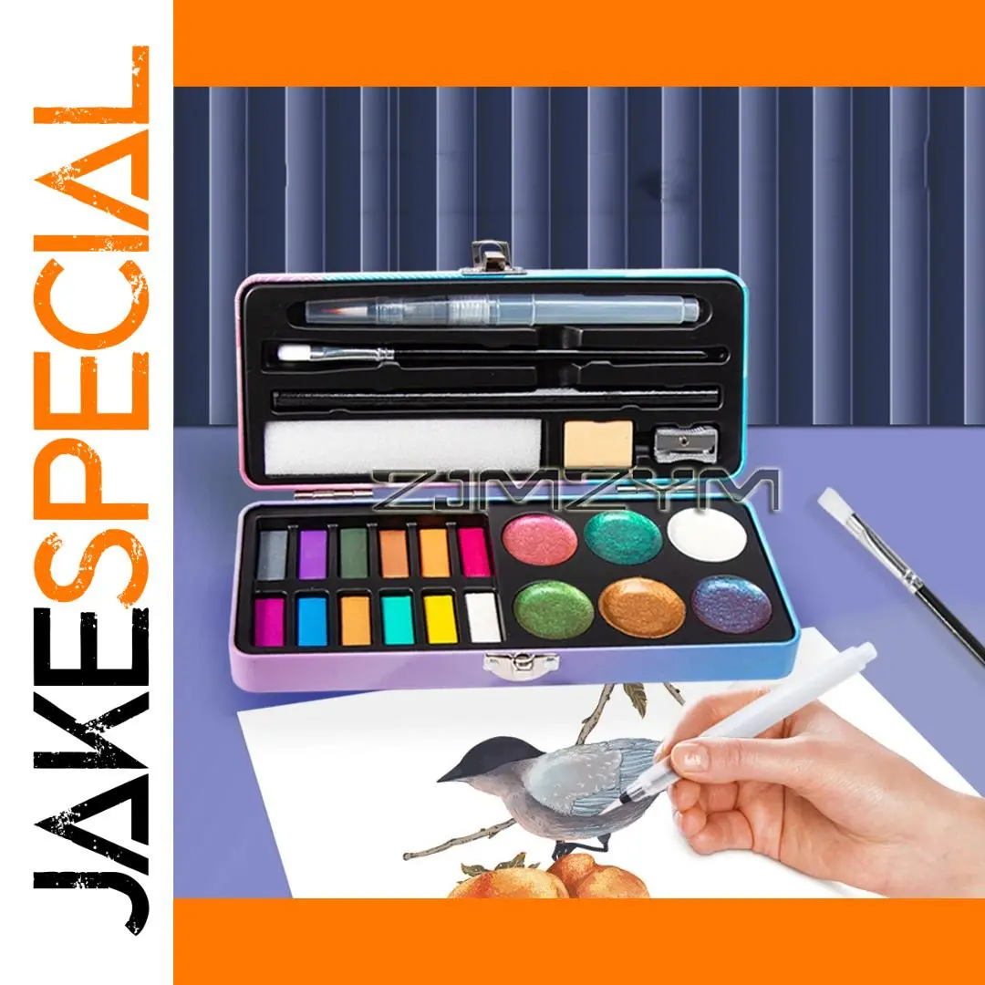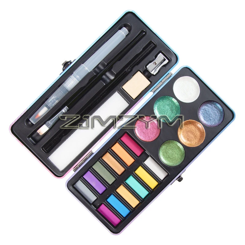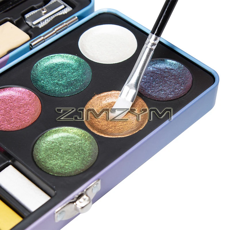 Immerse yourself in creative artistry with this vibrant watercolor set, perfect for both beginners and professional artists. The sleek, rectangular case features a glossy pink surface accented with light blue edges, making it stylish and portable for artistic adventures. Inside, you'll find a well-organized collection of tools, including transparent and metallic waterbrush pens, a fountain pen, pencil, sponge, rubber, and sharpener, all designed to enhance your painting experience. The set contains 12 light-colored beads, 6 chameleon colors, and a variety of watercolor pigments in bold oval and rectangular pans, offering a broad palette of vivid pinks, greens, oranges, browns, and blues. Visualize yourself creating beautiful artworks anytime inspiration strikes, with all essentials in one compact package.